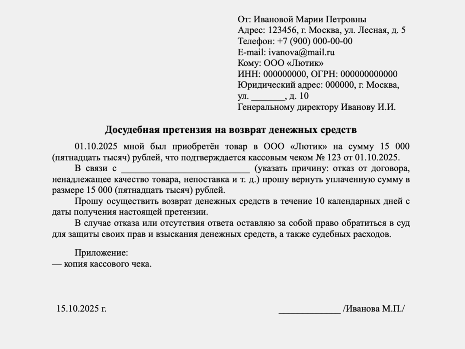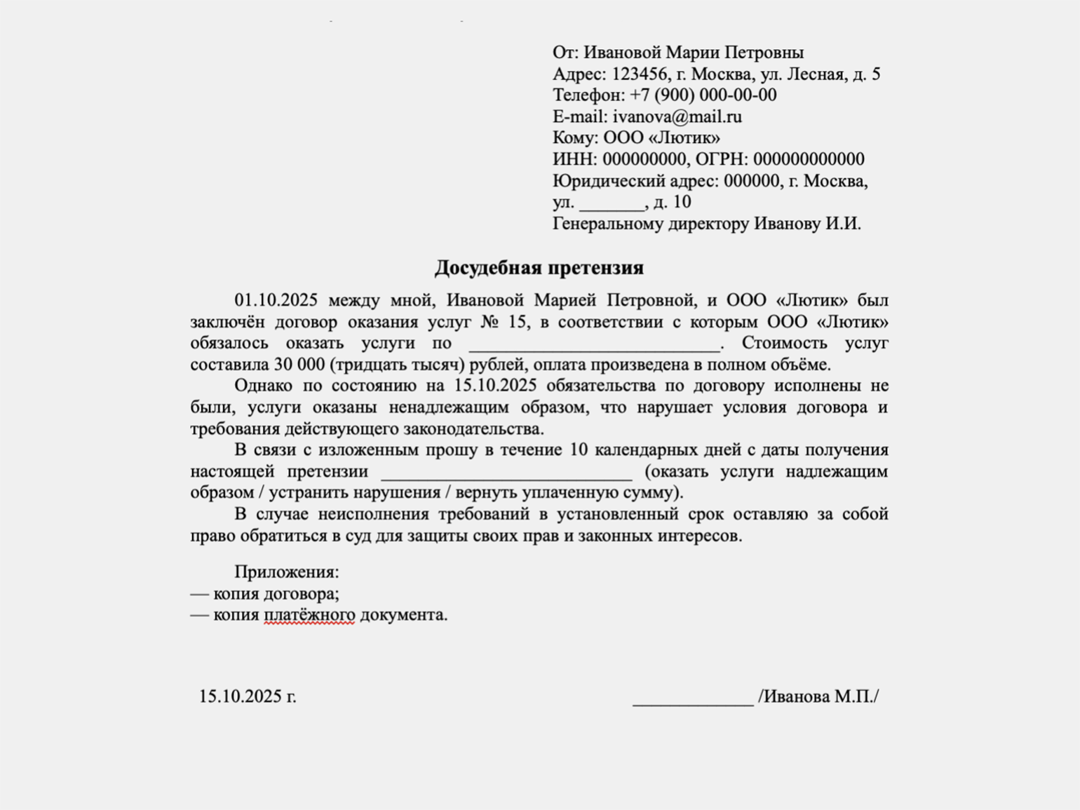 Обычно её используют в спорах с продавцами, исполнителями услуг, подрядчиками или арендодателями. Такую досудебку составляют в свободной форме — указывают данные заявителя, описывают ситуацию, формулируют требования и устанавливают срок для ответа.