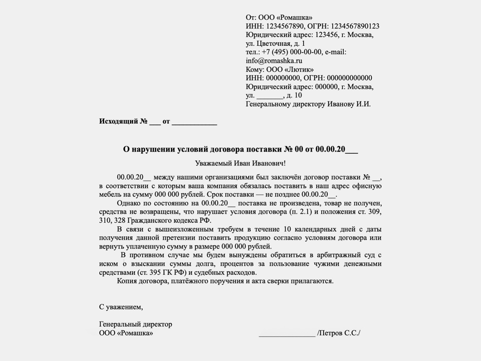 Чаще всего её составляют при нарушении условий договора — поставки, подряда, аренды или оказания услуг. Обычно такие письма оформляют на фирменном бланке, с указанием реквизитов компании и с обязательной ссылкой на договор и нормы закона, которые были нарушены.