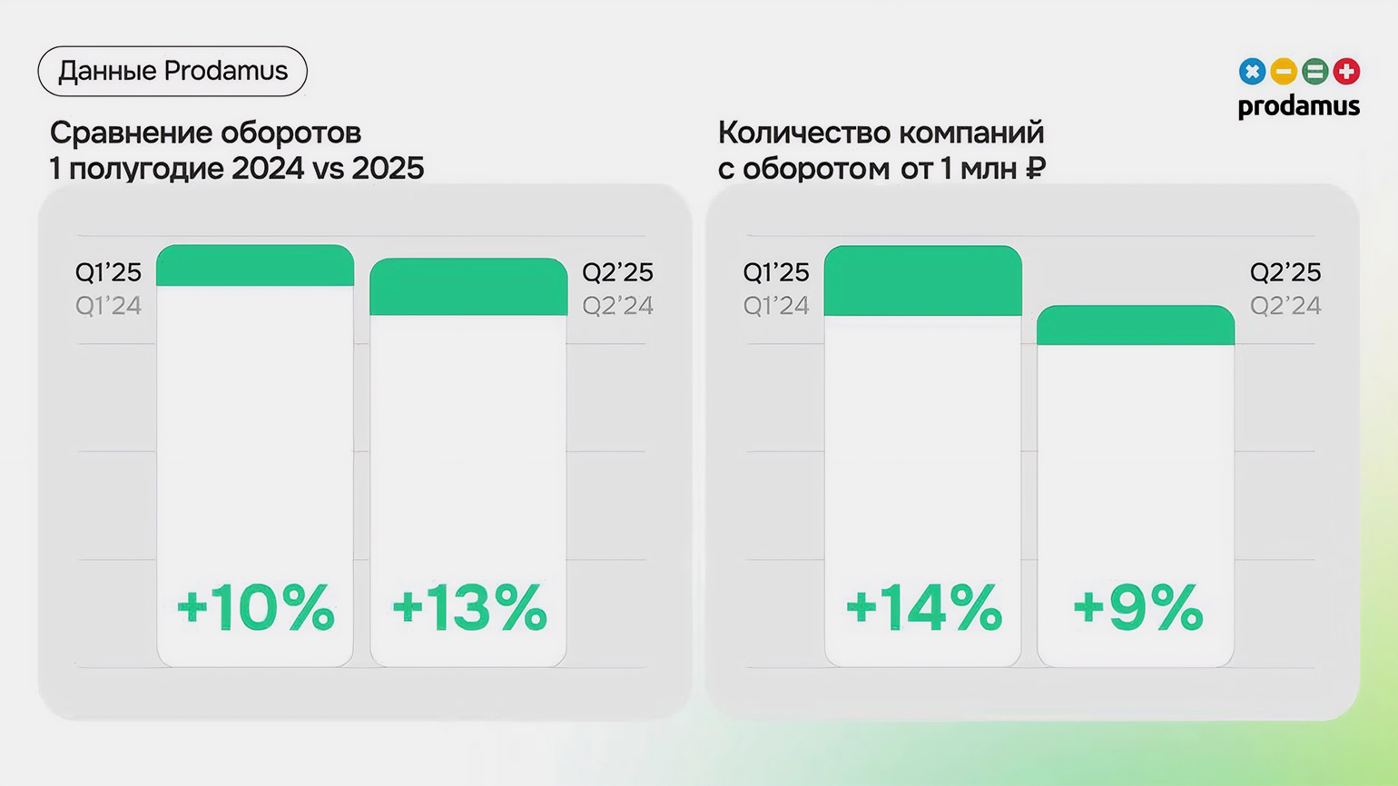 В компании Prodamus отмечают похожую динамику: оборот клиентов сервиса в первом квартале 2025 года вырос на 10% год к году, а во втором — на 13%. Количество компаний с ежемесячным оборотом от 1 миллиона рублей за тот же период увеличилось на 14 и 9% соответственно. По прогнозам, во втором полугодии рост может составить ещё 12–15%.