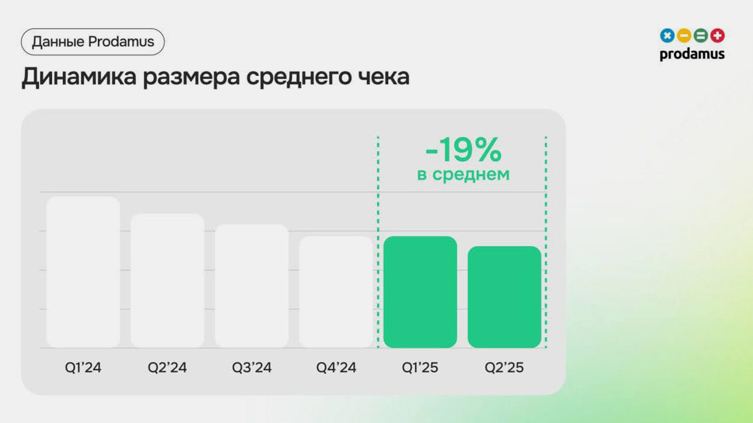 По данным Data Insight, в 2024 году средний чек в российском онлайн-бизнесе снизился до 1650 рублей. Prodamus подтверждает ту же тенденцию и в 2025-м — за первые два квартала показатель упал на 19%.