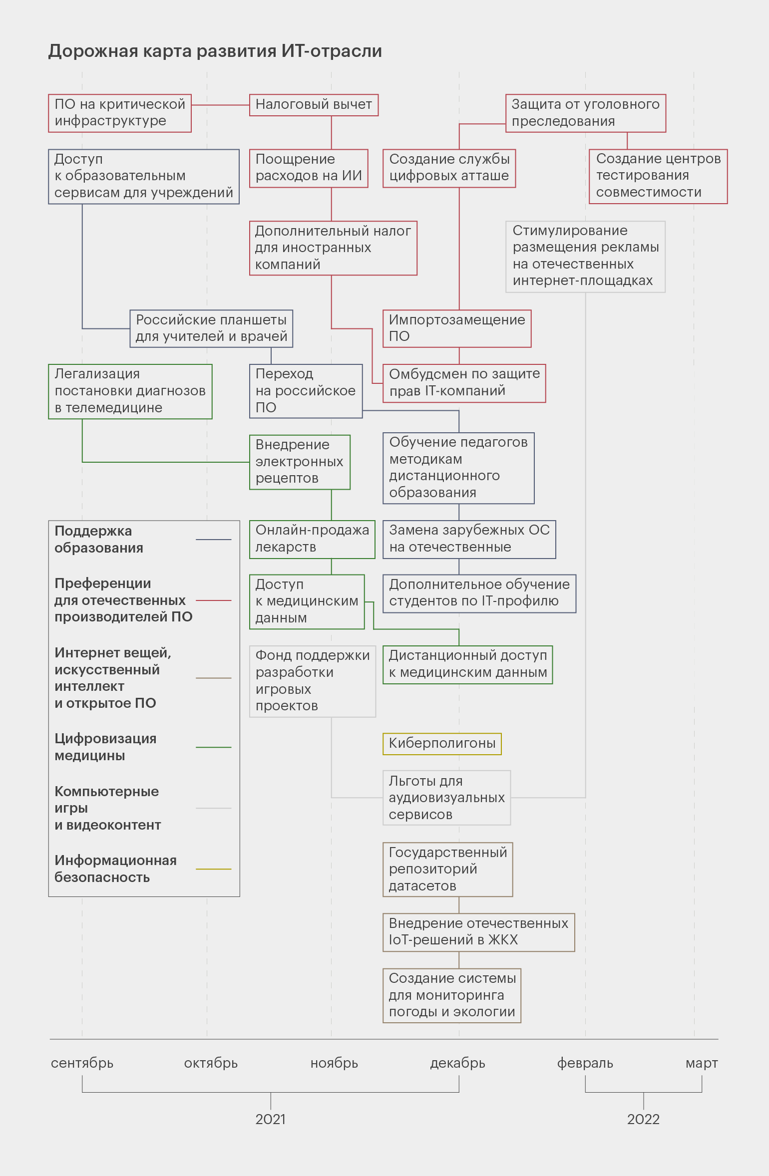 В сентябре 2021 года правительство России утвердило второй пакет мер поддержки IT-отрасли и представило дорожную карту. В документе отражены предложения, сроки реализации и ожидаемый результат.