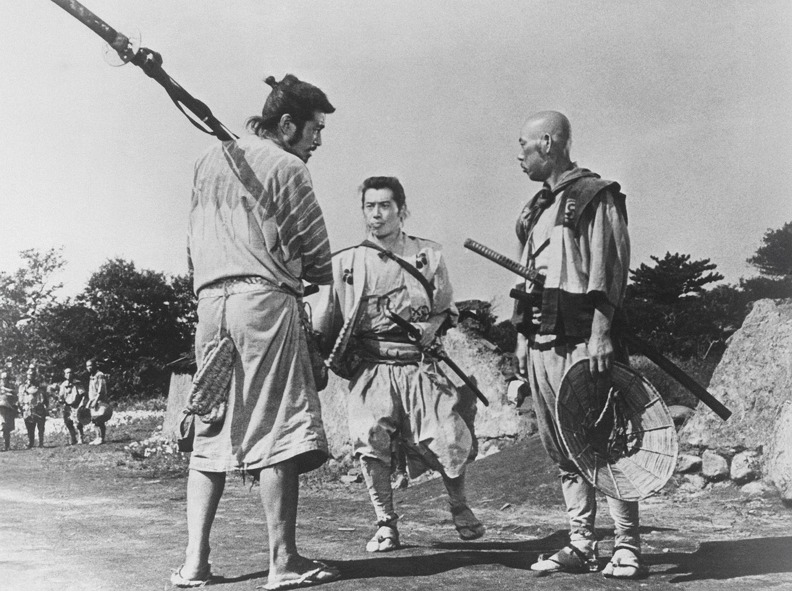 Наверное, самый известный из кинопримеров; история простая и тоже мифологичная в своей лаконичности. Семь воинов защищают деревню от превосходящих сил. Здесь мы почти не видим противоборствующей стороны, бандиты — это мощный, страшный враг, стихия, смерть. Зато у каждого из самураев — свои мотивы вступить в битву и своя участь.
