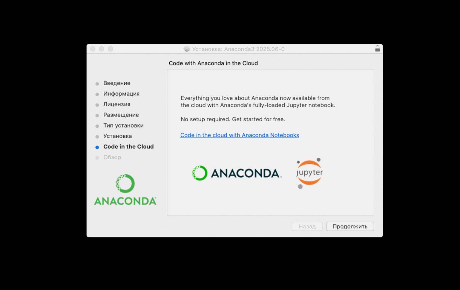 Для macOS есть несколько версий Anaconda для Intel и чипов M-серии. После скачивания вам нужно запустить скачанный дистрибутив, и программа-установщик всё сделает сама — просто дождитесь завершения процесса и на одном из этапов примите лицензионное соглашение.