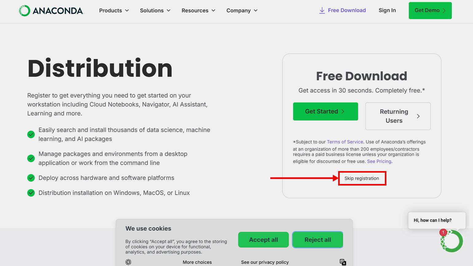 Для выбора дистрибутива вам нужно нажать на кнопку Free Download. Однако, если вы кликнете, страница может просто обновиться, и ничего не изменится — так разработчики намекают, что нужно выбрать кнопку Get Started и зарегистрироваться. В 2025 году это делать не обязательно, поэтому вы можете кликнуть на Skip registration и перейти к загрузкам.