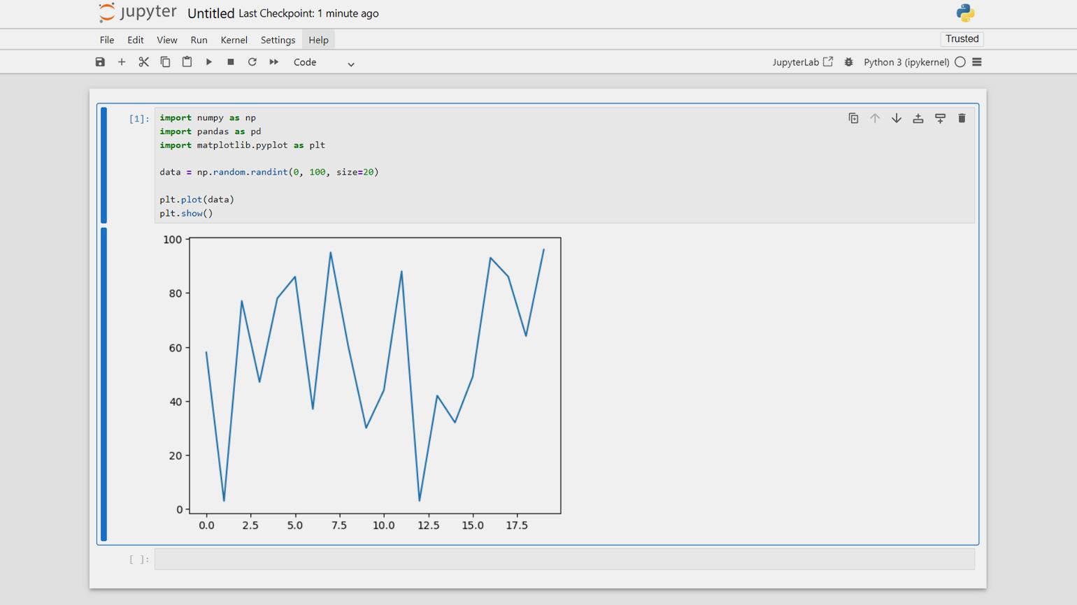 После ввода команды в браузере откроется интерфейс Jupyter Notebook. В этой среде вы можете писать код, создавать визуализации и добавлять текстовые пояснения. Например, ниже мы добавим код, который построит простой линейный график на основе случайных чисел: