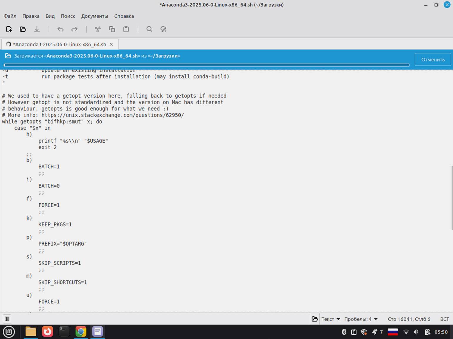 Скачиваем дистрибутив Anaconda и открываем терминал. Если мы просто щёлкнем по скачанному файлу, то он откроется как обычный текстовый документ, — это нормально, но установка так не запустится: