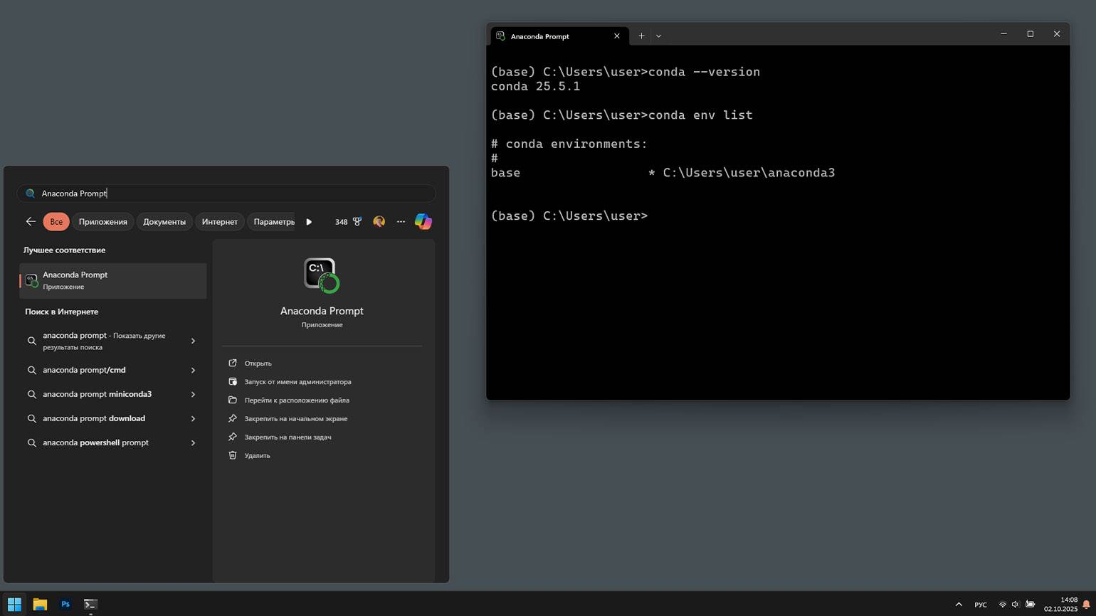 После установки Anaconda в меню «Пуск» появляется ярлык Anaconda Prompt — это командная строка, где менеджер Conda уже активирован. Вы можете ввести уже знакомую команду conda --version для проверки версии или посмотреть список доступных окружений conda env list.