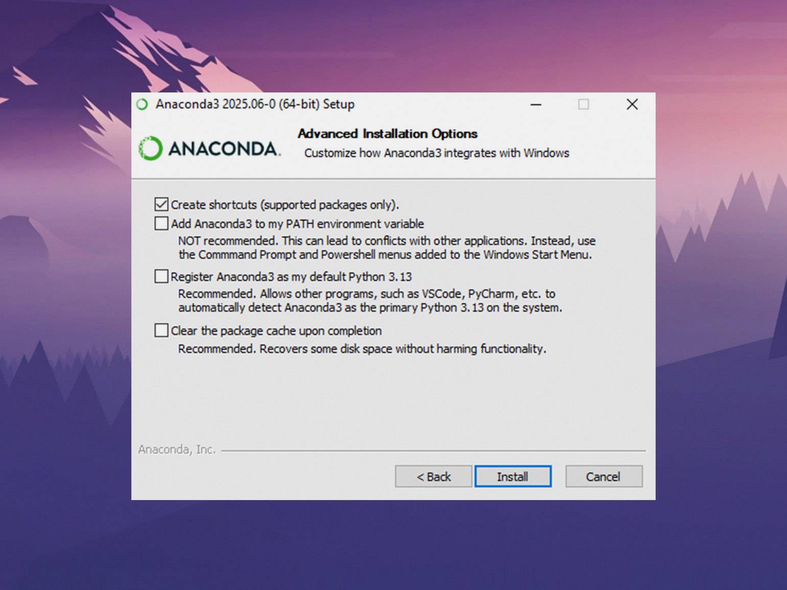 - Register Anaconda as my default Python — устанавливает Anaconda как основную версию Python в системе. Это означает, что все файлы с расширением .py будут открываться через интерпретатор Python из Anaconda, а не через IDLE или другие редакторы кода.