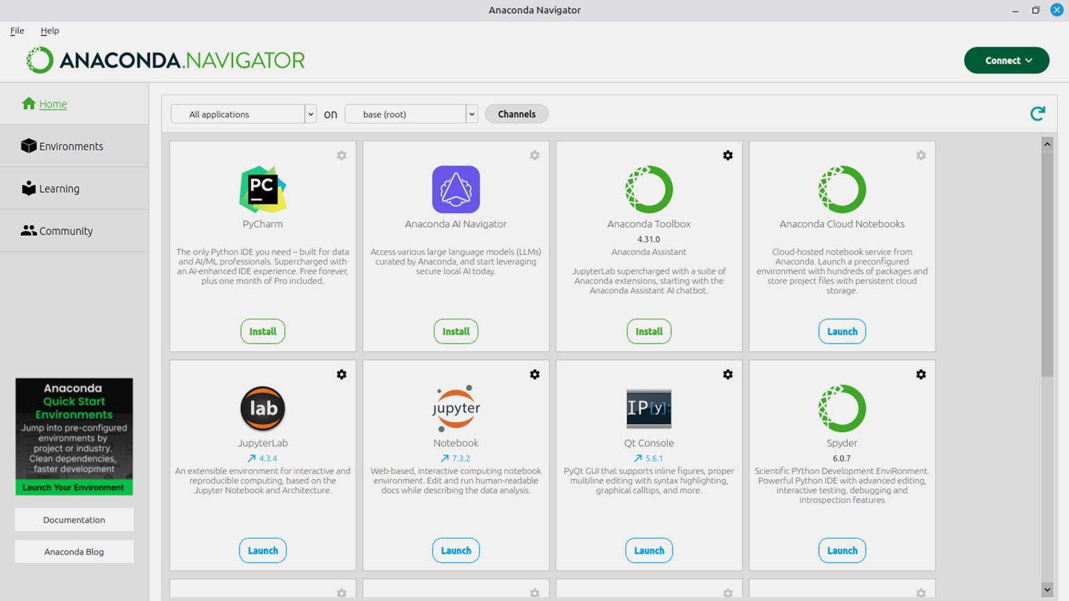 После установки вы можете работать с Anaconda напрямую через терминал или загрузить графический интерфейс как в Windows и macOS. Для добавления визуальной оболочки выполните команду: