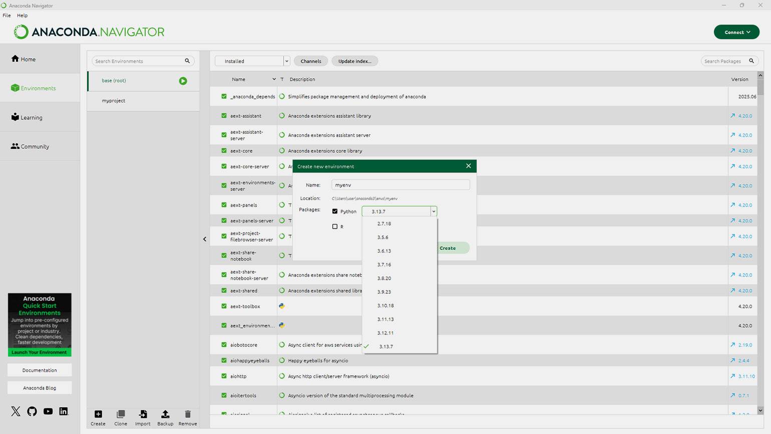 Для практики перейдите на вкладку Environments, нажмите кнопку Create, затем укажите название нового окружения и выберите нужную версию Python. После нажатия кнопки Create окружение появится в общем списке и будет готово для установки необходимых библиотек. А на вкладке Home вы сможете в один клик запустить Jupyter Notebook.