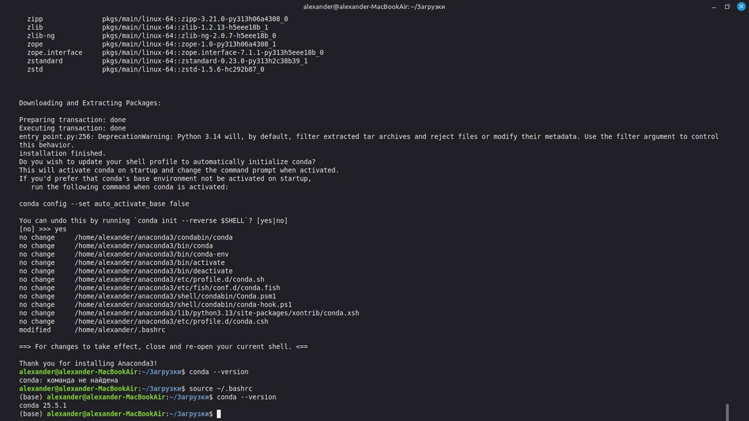 После этого начинается процесс установки. Вам нужно принять лицензионное соглашение и ответить на несколько вопросов системы — например, подтвердить путь установки и разрешить автоматическую настройку conda. После завершения установки перезапустите терминал или попробуйте вручную обновить настройки следующей командой: