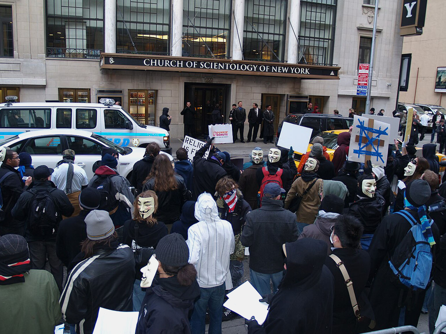 В знак протеста они провели DDoS-атаки на сайты Церкви саентологии, выпускали про них сатирические видео и манифесты, а затем вышли на мирные уличные протесты в масках Гая Фокса с плакатами «Знание — это свобода» в десятках городов по всему миру.