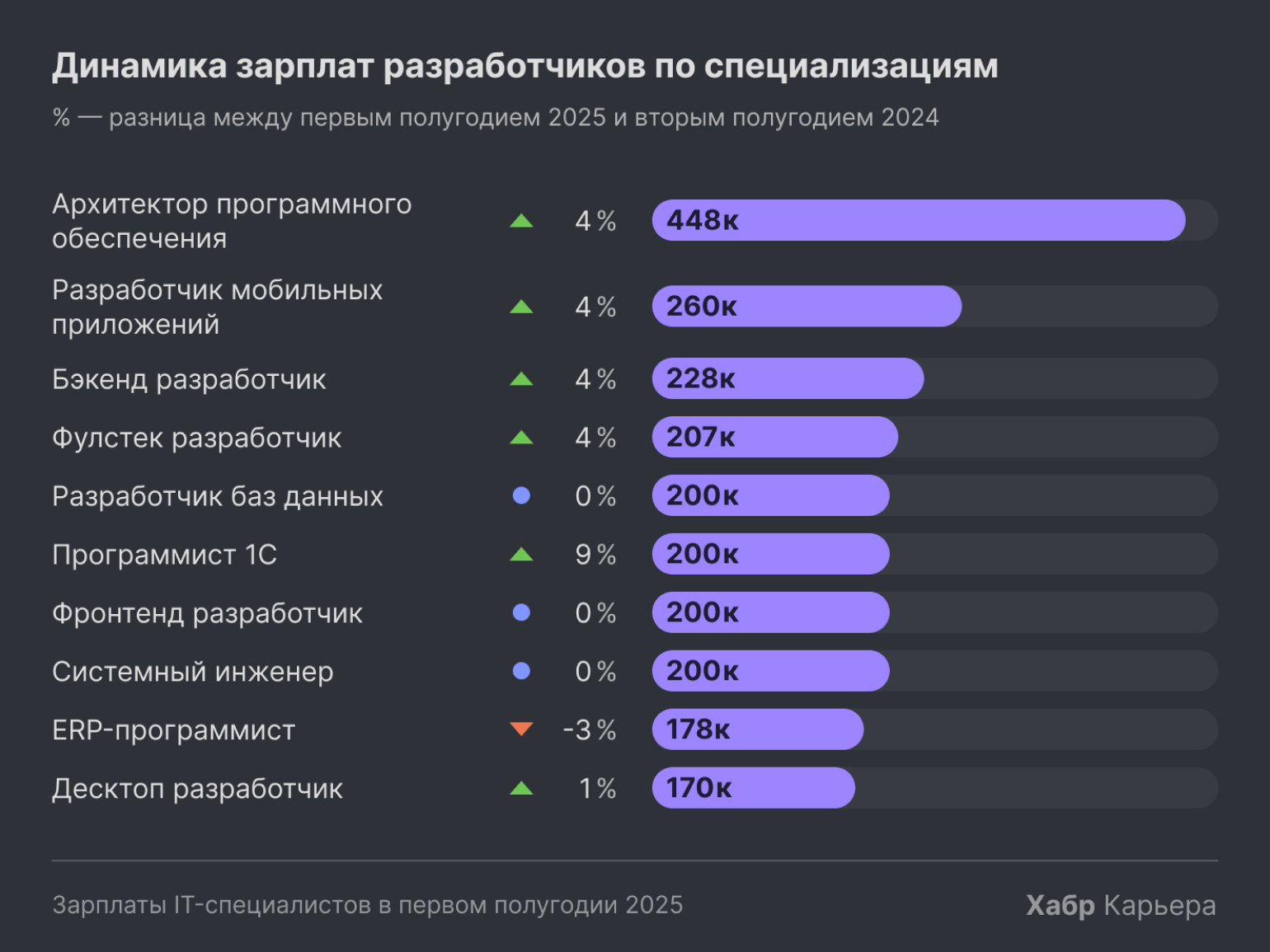По данным «Хабр Карьеры» за первое полугодие 2025 года, медианная зарплата архитектора в ПО в России — 448 000 рублей. Это заметно выше, чем у большинства мобильных и бэкенд-разработчиков — разница может достигать 50–60%.