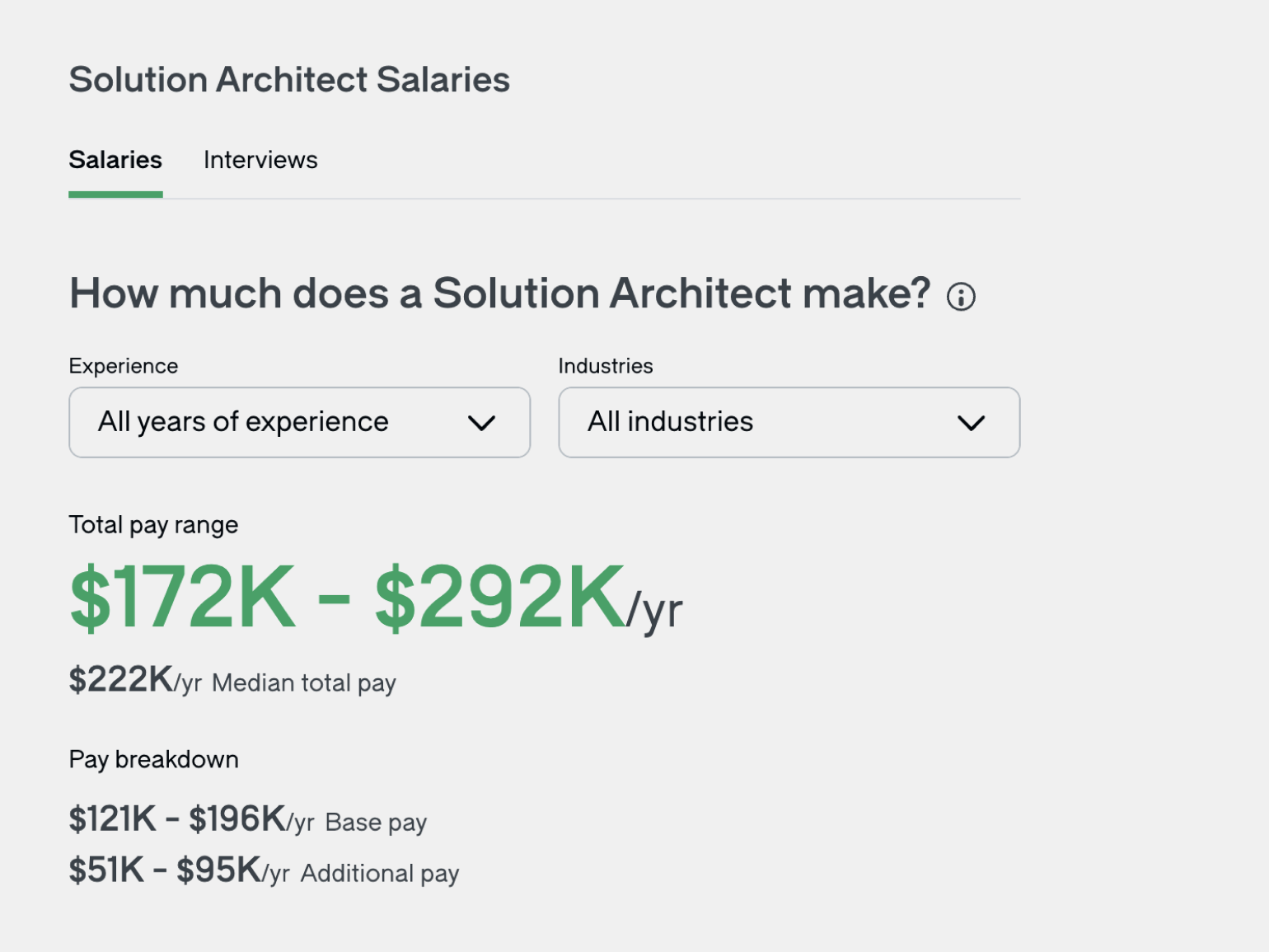 За рубежом доходы значительно выше. В США медианная зарплата архитектора ПО составляет около 222 тысяч долларов в год. При этом диапазон тоже широкий — примерно от 106 тысяч долларов до 311 тысяч долларов в зависимости от компании, штата и специализации.