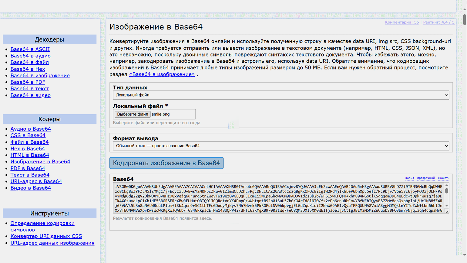 Давайте закодируем файл smile.png. Выбираем кодер Изображение в Base64, загружаем файл и жмём Кодировать изображение в Base64.
