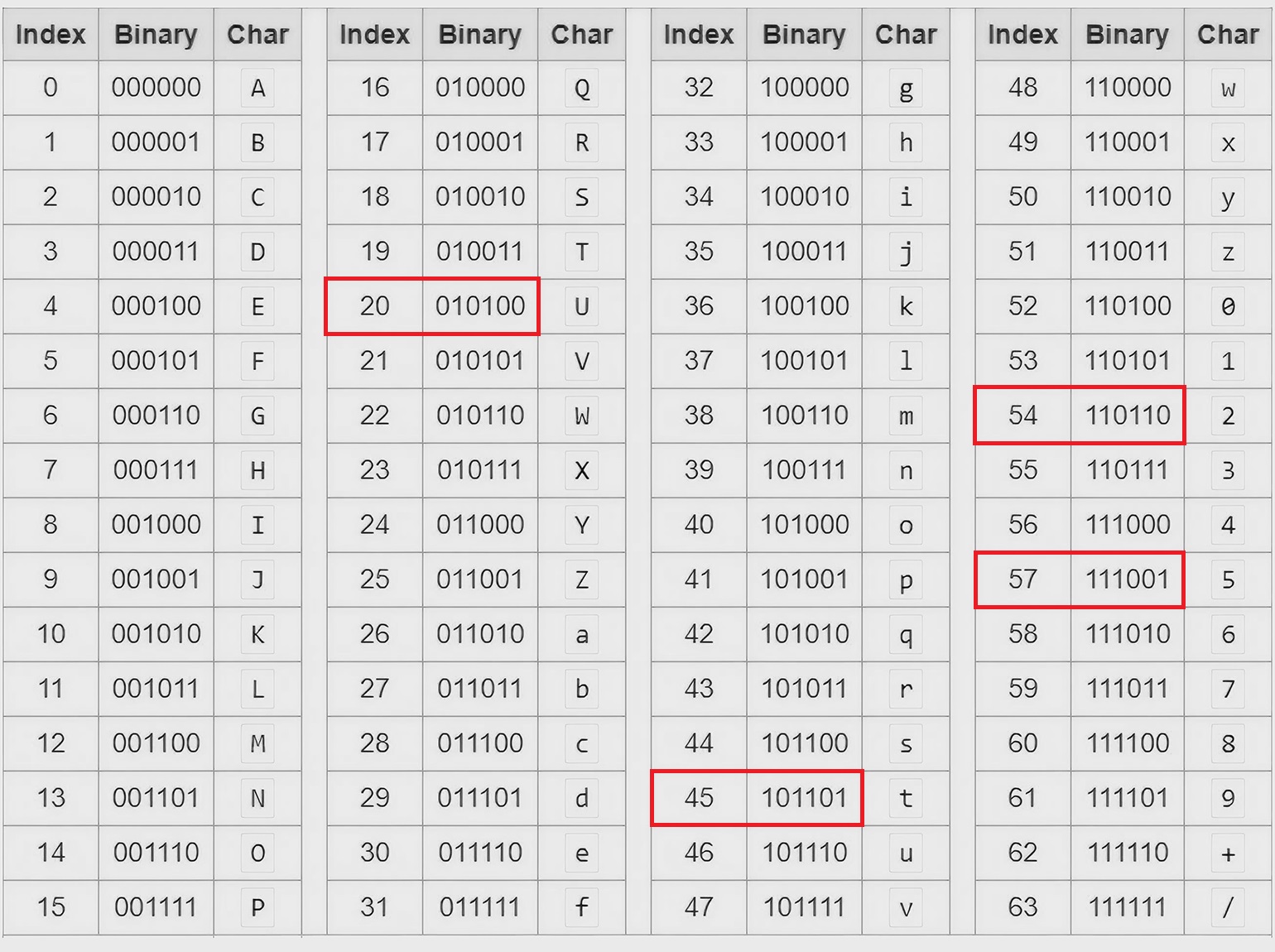 24-битный блок делится на четыре группы по шесть бит. Каждая группа представляет собой число от 0 до 63, которое используется как индекс для поиска соответствующего символа в таблице алфавита Base64: