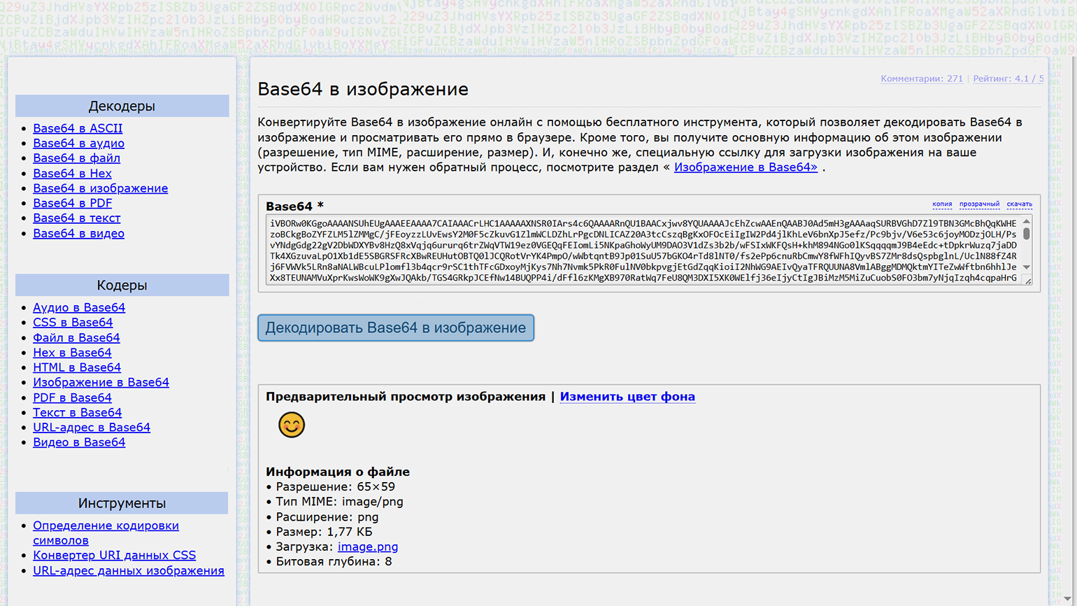 Теперь декодируем строку обратно в изображение. Копируем её, выбираем декодер Base64, загружаем строку и нажимаем Декодировать Base64 в изображение. Получаем исходный смайлик.