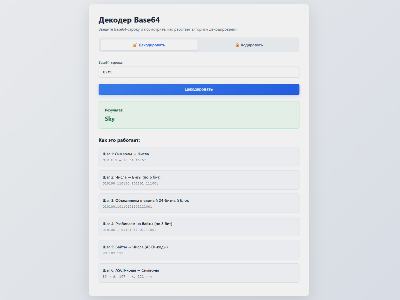 Среди других сервисов можно использовать base64encode.org и CyberChef. А ещё рекомендуем попробовать наш кастомный декодер, который мы сделали для этой статьи. Его фишка в том, что он не просто кодирует, но и показывает все шаги преобразования текста в строку Base64 и обратно. Например, вот так кодируется знакомое слово Sky: