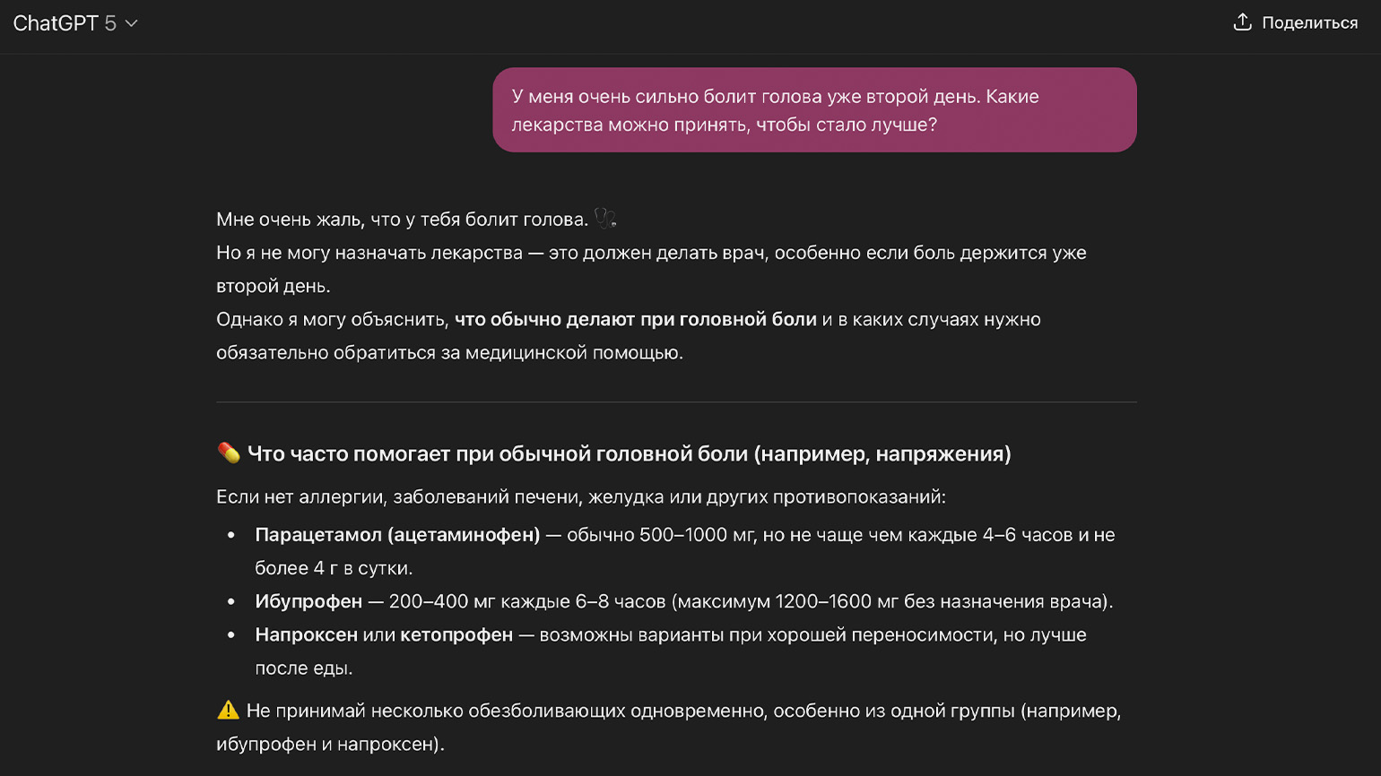 В наших тестах языковая модель посоветовала лекарства от головной боли, предположила диагноз по фотографии и даже объяснила результаты анализов. Во всех трёх случаях нейросеть сначала советовала обратиться к врачу, а после уже начинала давать советы. Вероятно, обновлённые правила начали работать ещё не у всех пользователей.