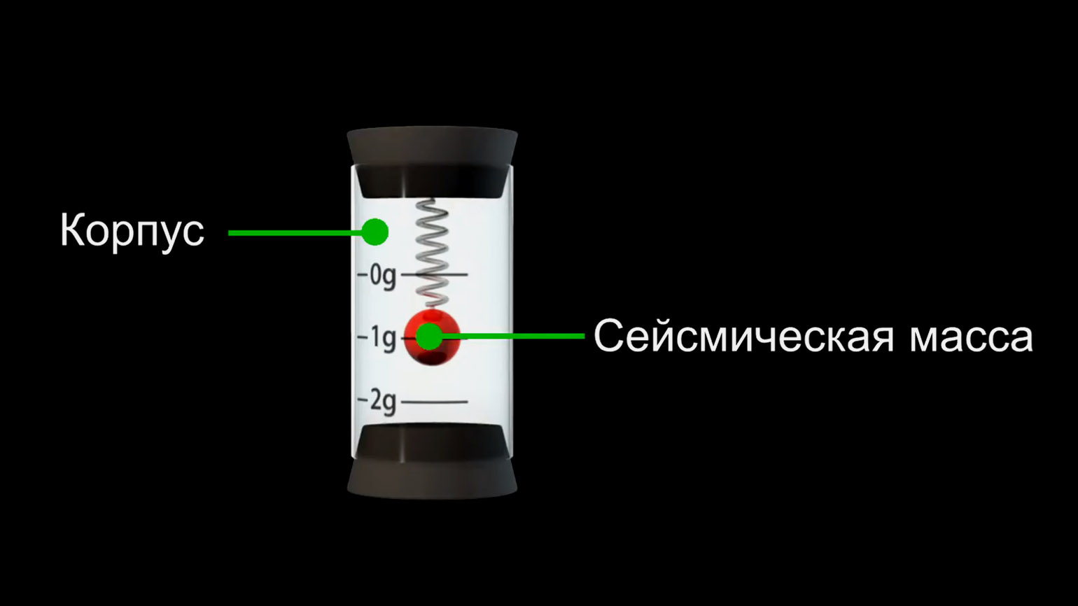 Представьте герметичную колбу, внутри которой на пружине подвешен груз — так называемая сейсмическая масса. Если начать перемещать колбу в пространстве, груз будет смещаться вверх или вниз. Измерив силу натяжения пружины во время движения, можно будет вычислить силу ускорения устройства. Так работает простейший одноосный акселерометр — он фиксирует ускорение вдоль одной оси.