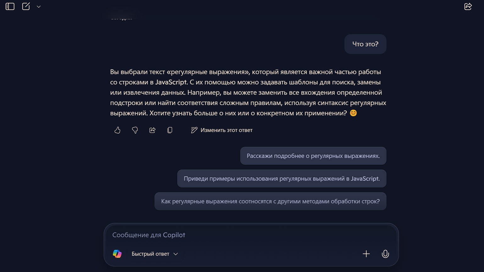 Удобно, что после любого уточнения Copilot сразу предлагает контекстные подсказки и варианты вопросов по теме. Например, после пояснения о регулярных выражениях он предложил несколько направлений того, как продолжить разговор: более подробное объяснение, примеры использования или сравнение с другими методами работы со строками. Это полезно, если вы только начинаете что-то изучать и пока не знаете, что спрашивать дальше.
