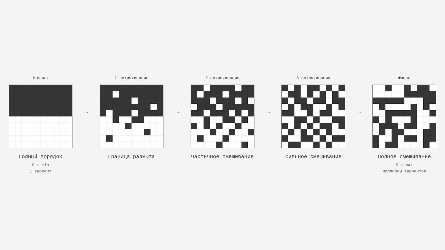 Поэтому при встряхиваниях происходит смешивание, а не разделение. В этом статистическом смысле энтропия растёт — не потому, что энергия или частицы «теряются», а потому, что система переходит в более вероятные состояния.