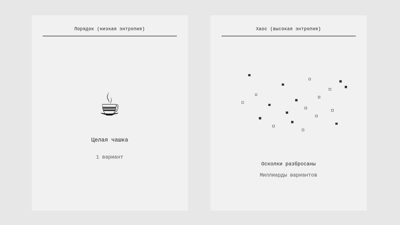 Если уронить чашку, она разлетится. Но как именно? Она может расколоться на две части, на три или на тысячи осколков. Осколки могут оказаться где угодно — под столом, у двери, в противоположных углах комнаты. Способов, как может выглядеть «разбитая чашка», колоссально больше. В популярных объяснениях это называют ростом «беспорядка». Это и есть состояние с высокой энтропией.