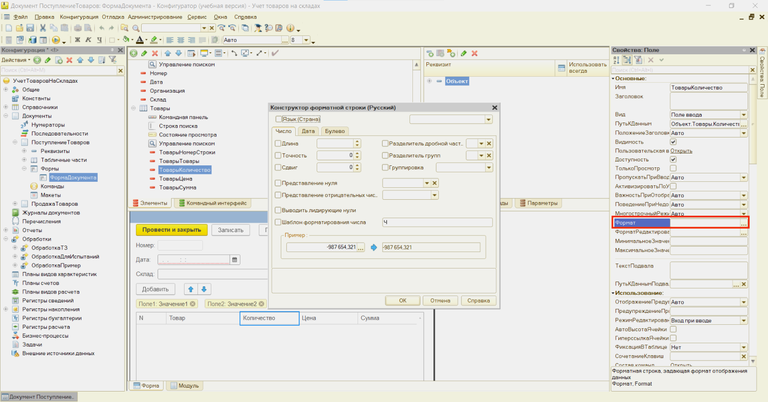 С помощью конструктора можно работать не только с кодом, но и с полями ввода в пользовательских формах. Для этого выберем и откроем конкретную форму, выберем нужное поле и в палитре свойств нажмём кнопку … у поля Формат. Откроется уже знакомое окно с параметрами для разных типов данных.