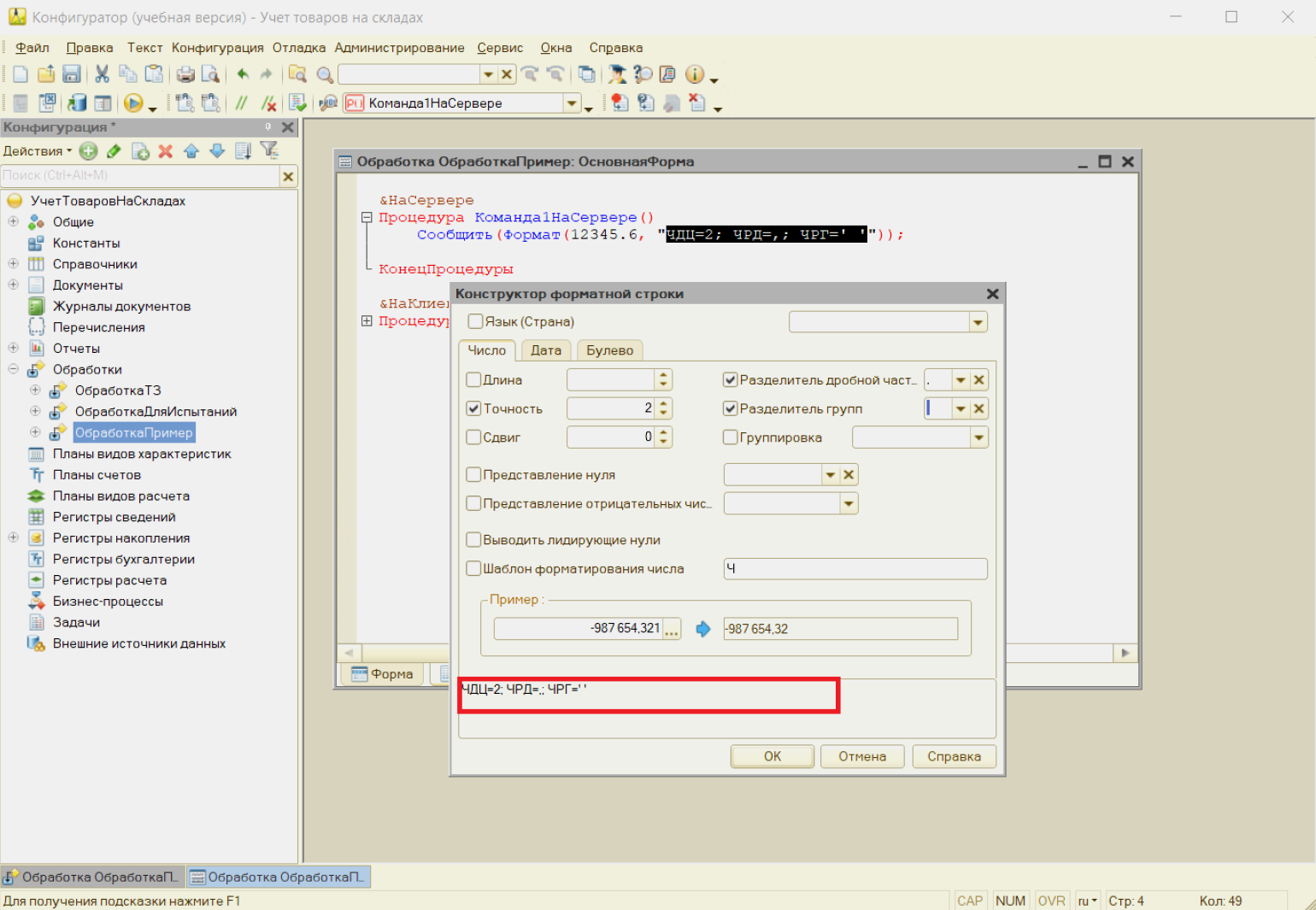 Аргумент ФорматнаяСтрока — шаблон, по которому система выведет результат. Форматная строка может быть простой, например «ЧН=2» (число с двумя знаками после запятой), или сложной, с несколькими параметрами через запятую.