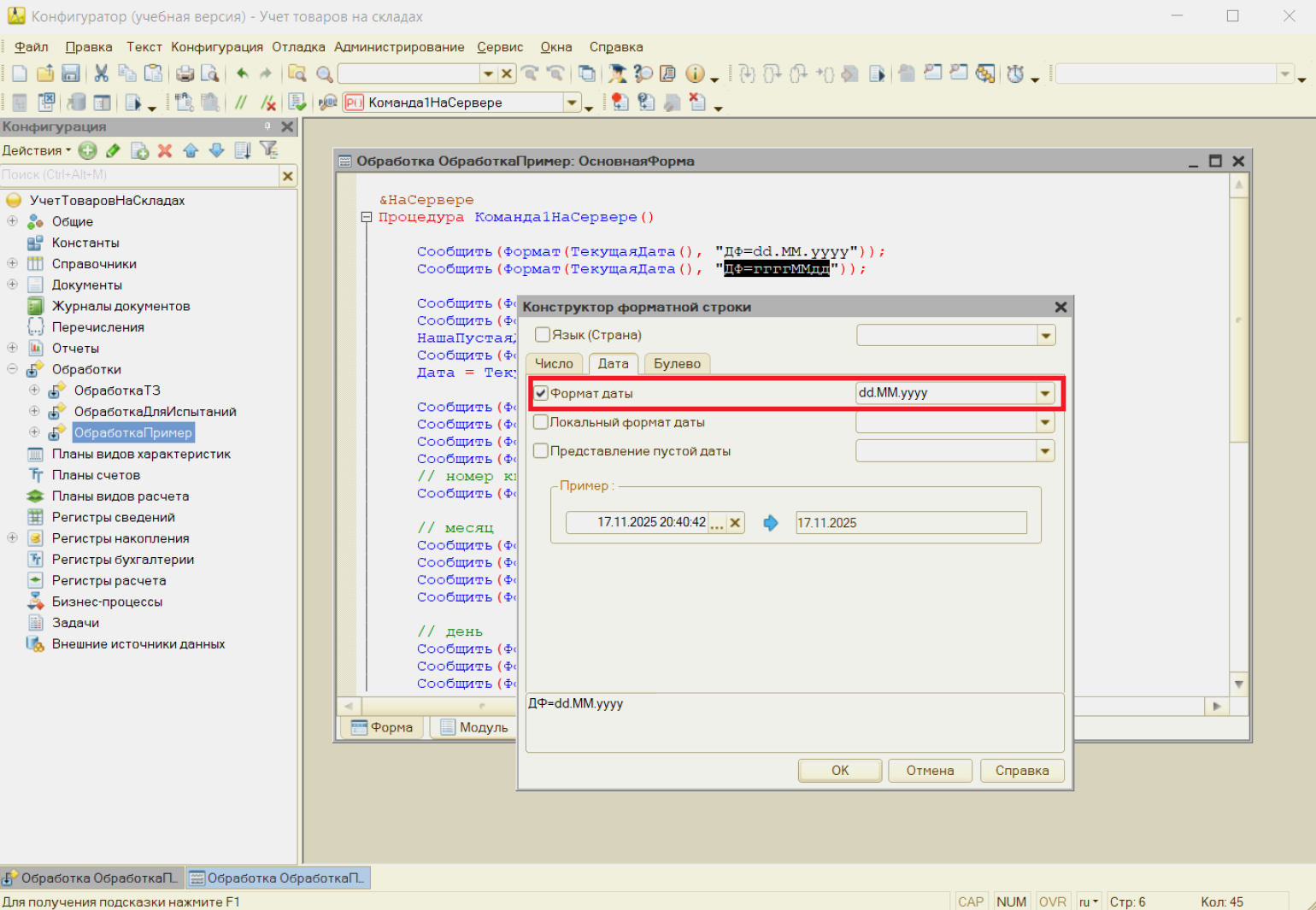Форматирование даты чаще всего используется в отчётах и печатных формах: оно делает документы понятнее для пользователей. Кроме того, если не указать формат даты, 1С может использовать региональные настройки системы. В итоге у одного пользователя дата может отображаться как 10.03.2025, а у другого — 03.10.2025. Чтобы избежать путаницы, всегда следует указывать шаблон явно.