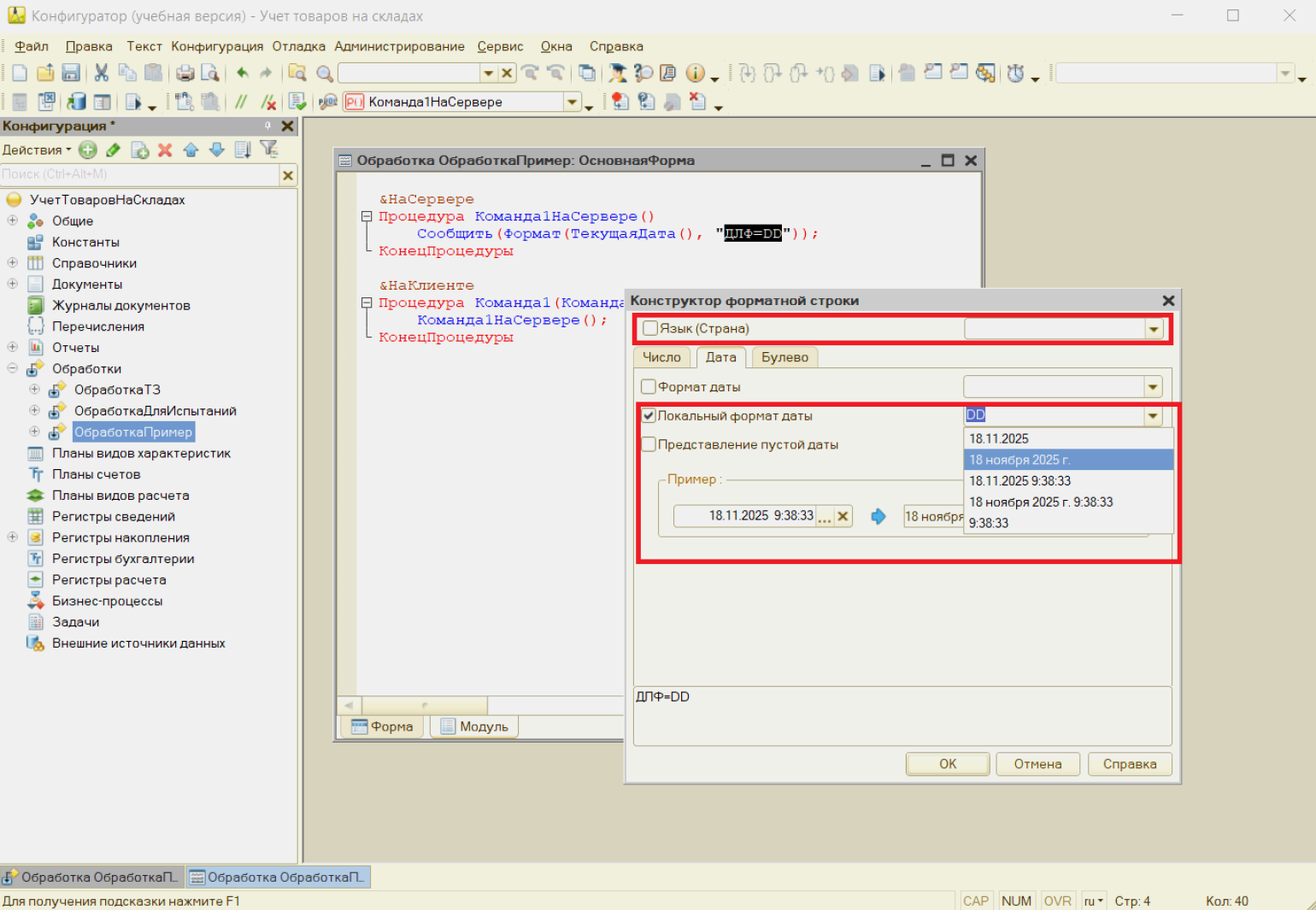 Локальный формат задаётся с помощью параметра ДЛФ. Он использует региональные настройки информационной базы (Конфигуратор → Администрирование → Региональные установки информационной базы) и данные параметра Язык (Страна). Благодаря этому один и тот же программный объект может выглядеть по-разному у пользователей из разных стран в соответствии с их обычным способом записи дат.