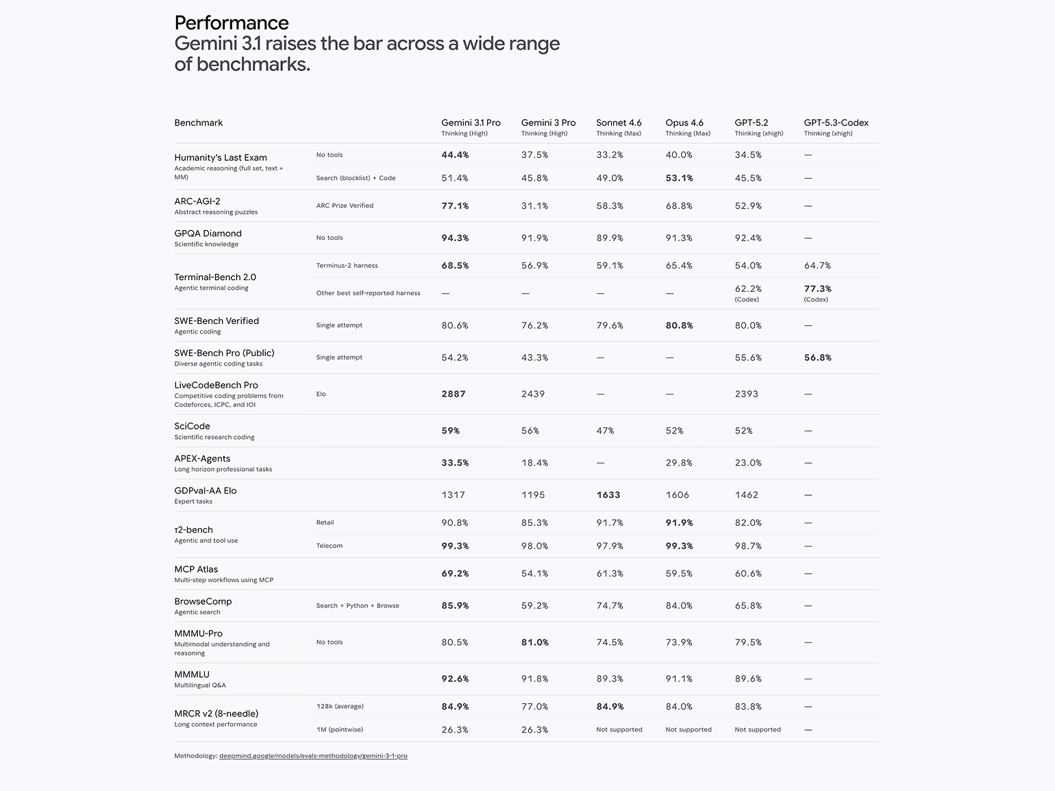 По результатам бенчмарков Gemini 3.1 Pro превосходит Gemini 3 Pro и ряд моделей других компаний в задачах на рассуждение, анализ научных данных, программирование и работу агентных систем.