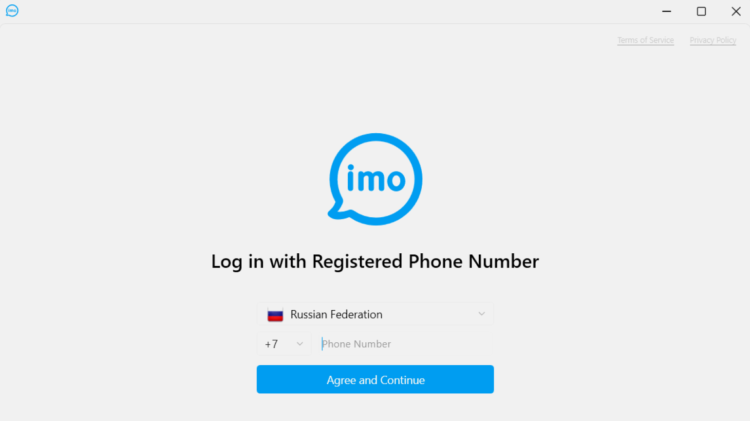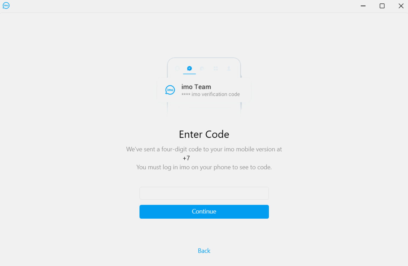 На стартовом экране выберите страну и введите номер телефона, который вы использовали при регистрации на смартфоне. Откройте мобильное приложение Imo, введите код верификации и нажмите Continue. Вас должно перебросить в главное окно мессенджера.