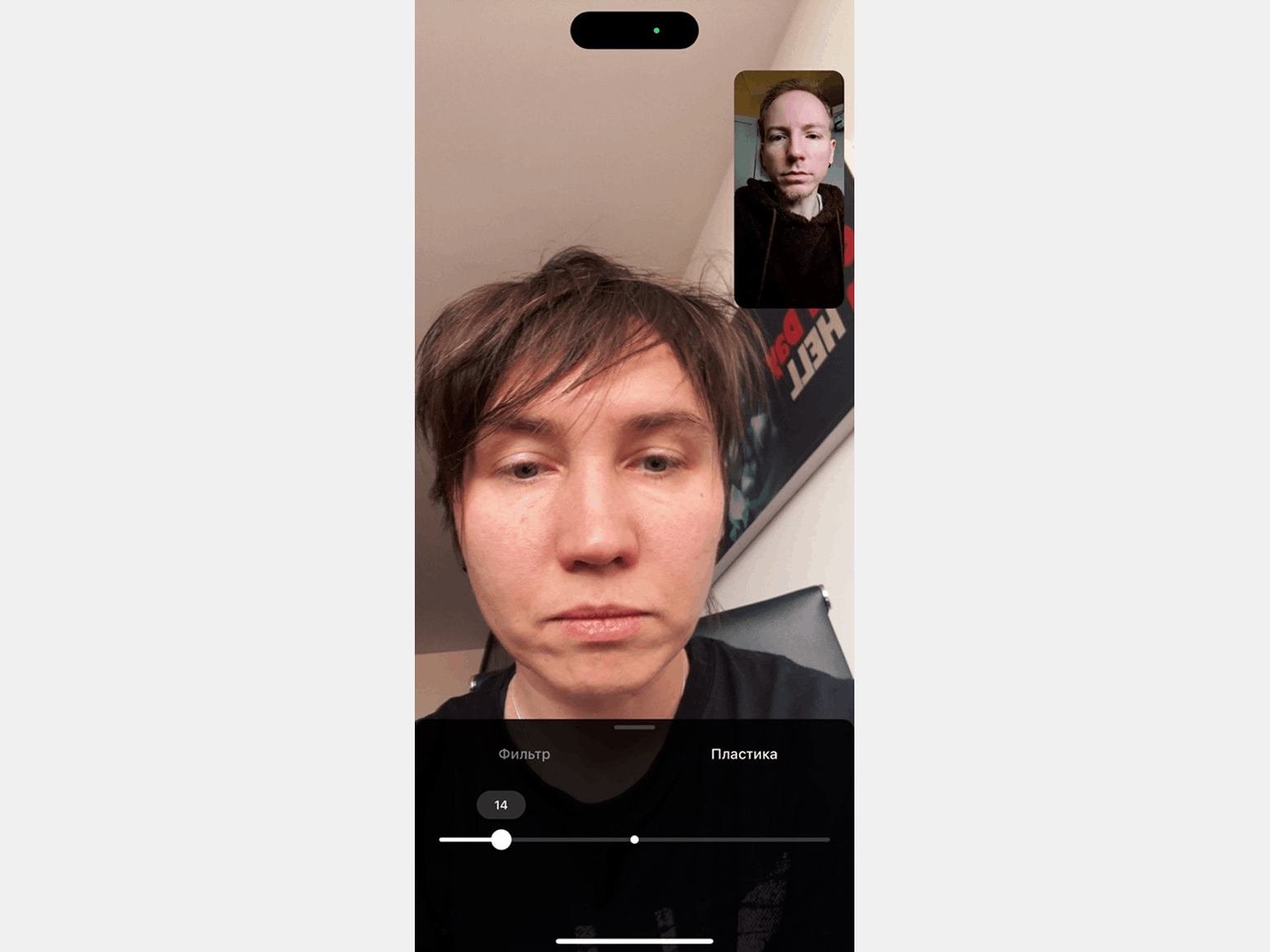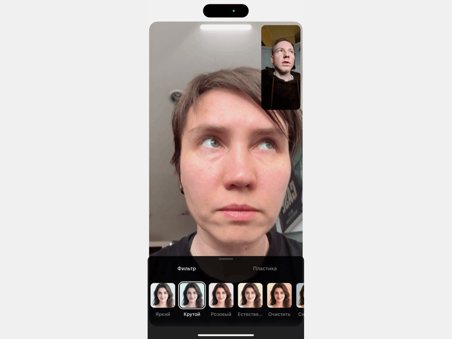 Во время видеозвонка вам доступны две панели инструментов. На нижней расположен стандартный набор: микрофон, переключение камеры, отключение камеры и завершение звонка. На верхней — три кнопки для работы с изображением. Лампочка открывает декоративные рамки с усиленной экспозицией — удобно для вечерних звонков. Кнопка с эмодзи даёт доступ к фильтрам цветокоррекции и инструменту ретуши Пластика. Третья кнопка размывает фон.