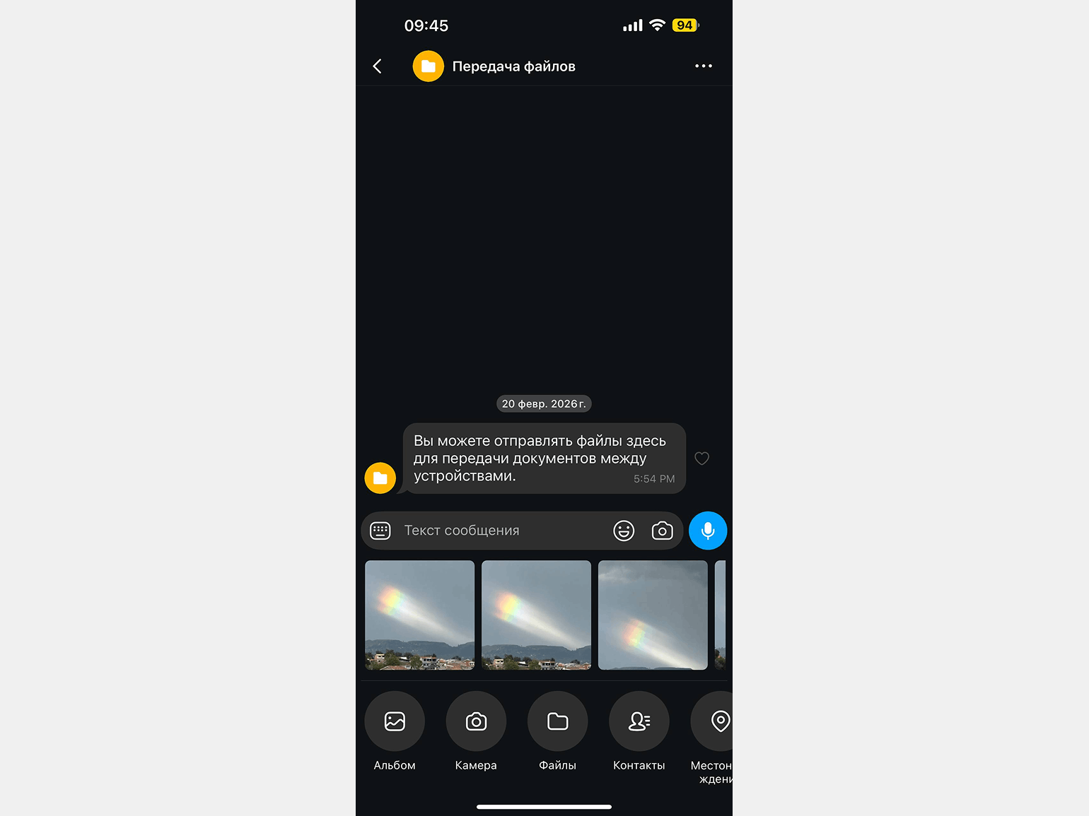 В основной вкладке мессенджера есть отдельный чат Передача файлов / File Transfer — аналог «Избранного» в Telegram. Сюда можно загружать любые файлы (документы, фотографии, видео, аудио) для облачного хранения или быстрого переноса между вашими устройствами — например, между телефоном и компьютером.