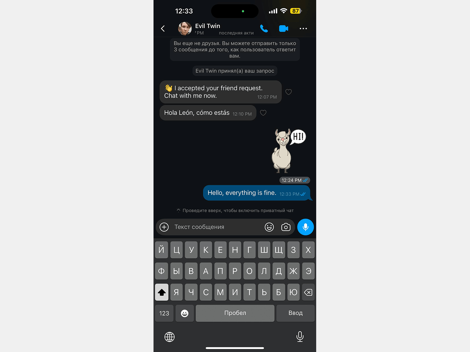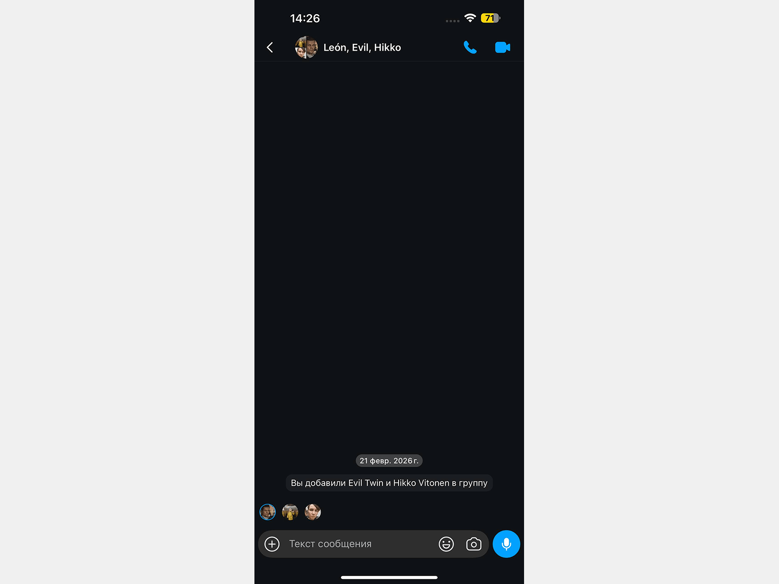 В приватной группе достаточно придумать название — и участники получат оповещение о добавлении. Если название не задано, мессенджер автоматически перечислит имена участников. Общение в группе устроено так же, как в обычном чате.
