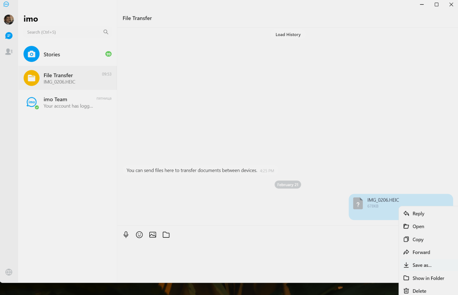 Отправленный файл (в данном примере изображение в формате HEIC) автоматически появится в десктопной версии Imo. Чтобы загрузить его на компьютер, достаточно кликнуть по нему левой кнопкой мыши.