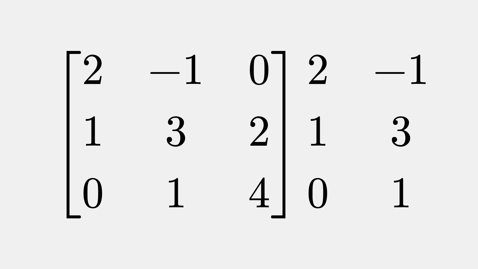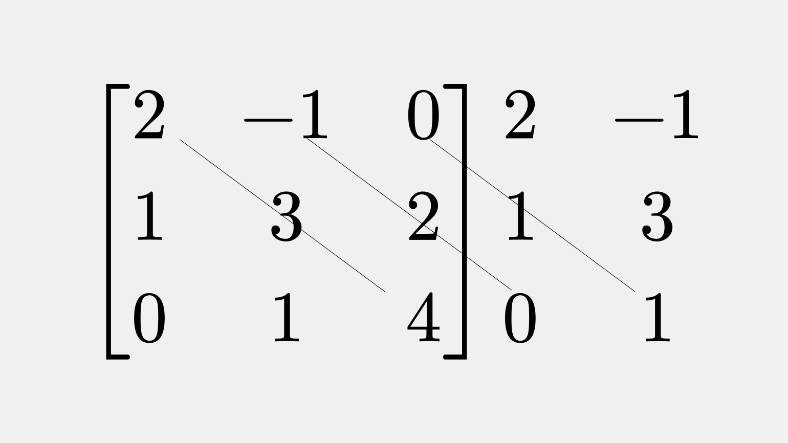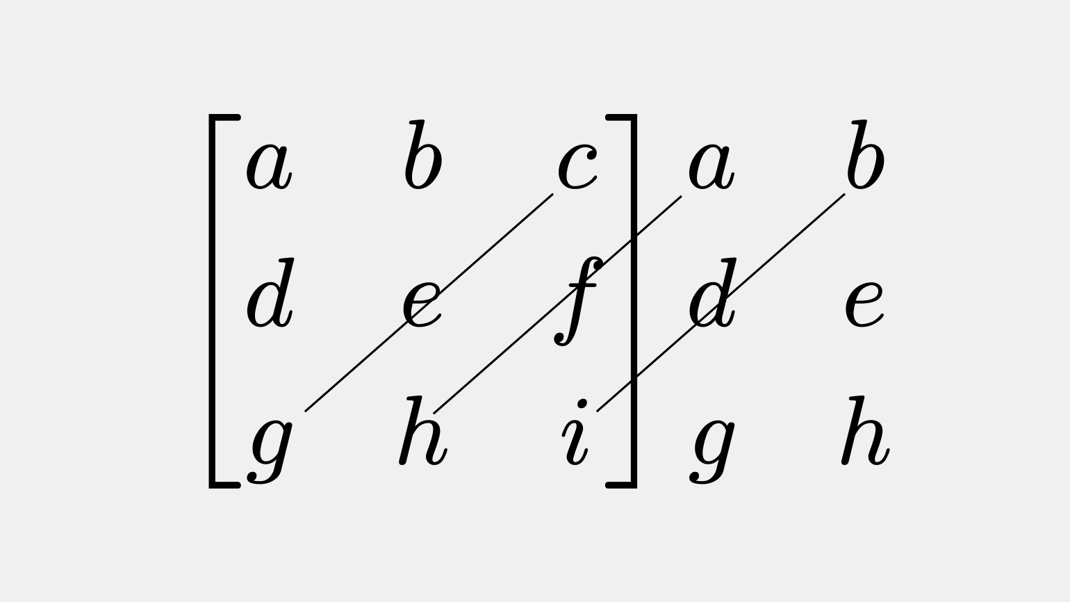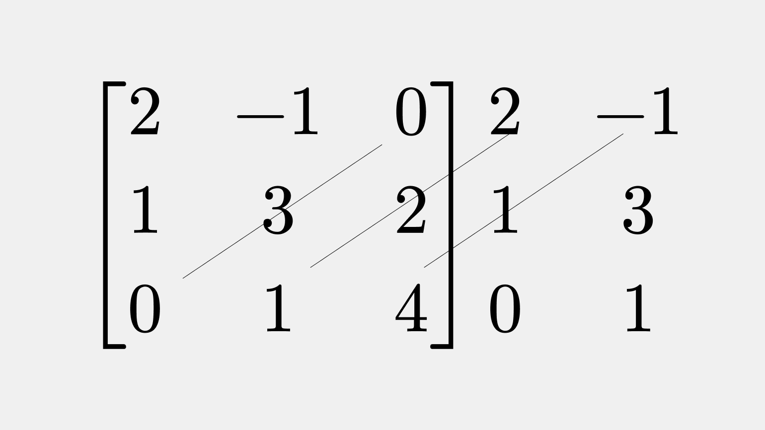 Чтобы найти детерминант, необходимо продублировать первые два столбца матрицы справа и посчитать произведения по диагоналям с учётом знаков.