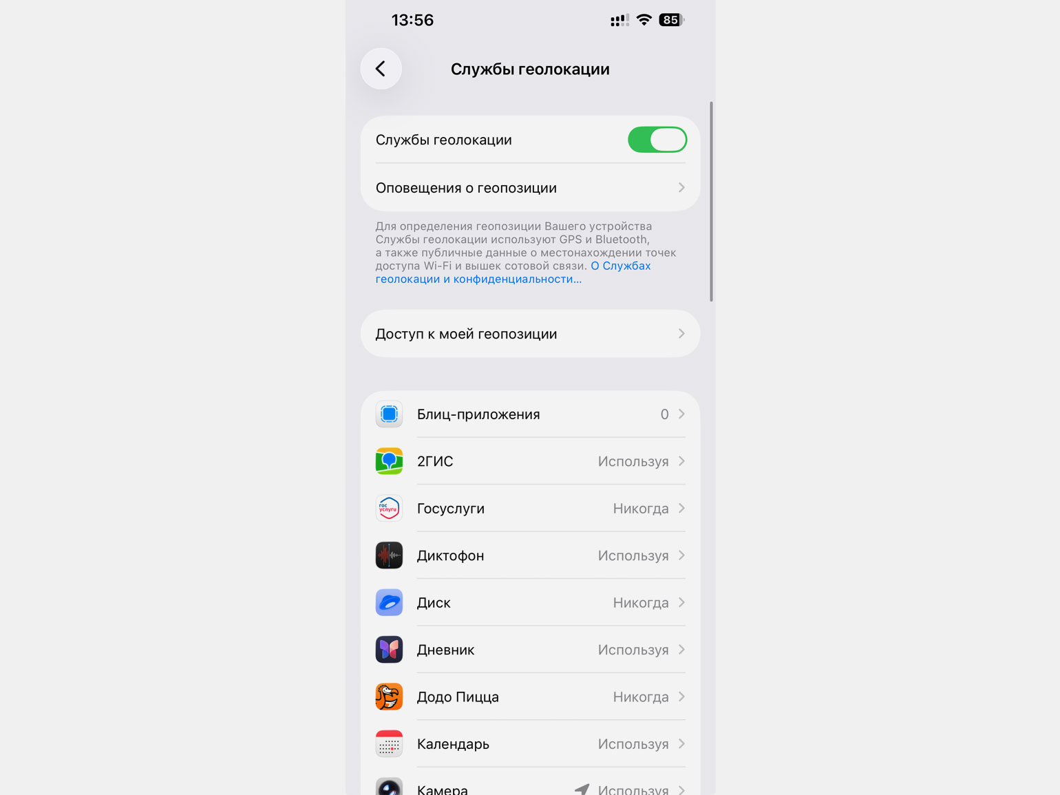 Для iOS: Настройки → Основные → Перенос или сброс iPhone → Сбросить → Сбросить геонастройки. После этого настройки доступа для всех приложений будут сброшены.