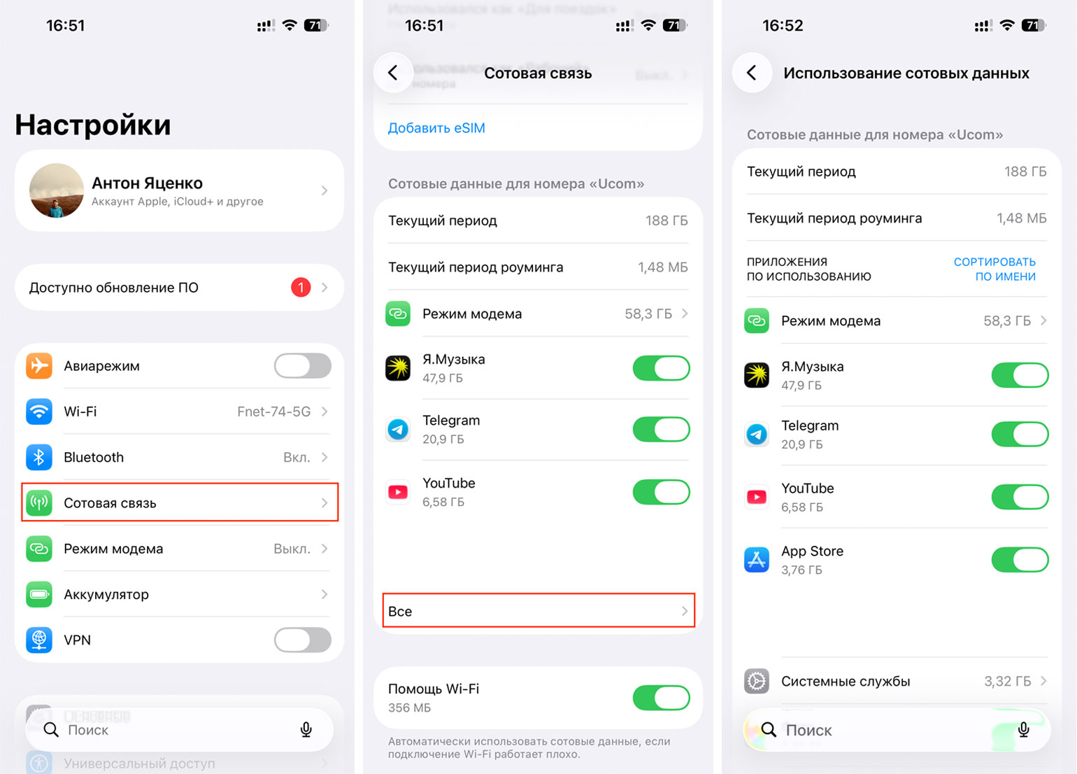 Зайдите в Настройки → Сотовая связь → Все. Посмотрите по списку, какие приложения потребляют больше всего данных. Необычно высокий расход может указывать на передачу данных шпионским ПО.