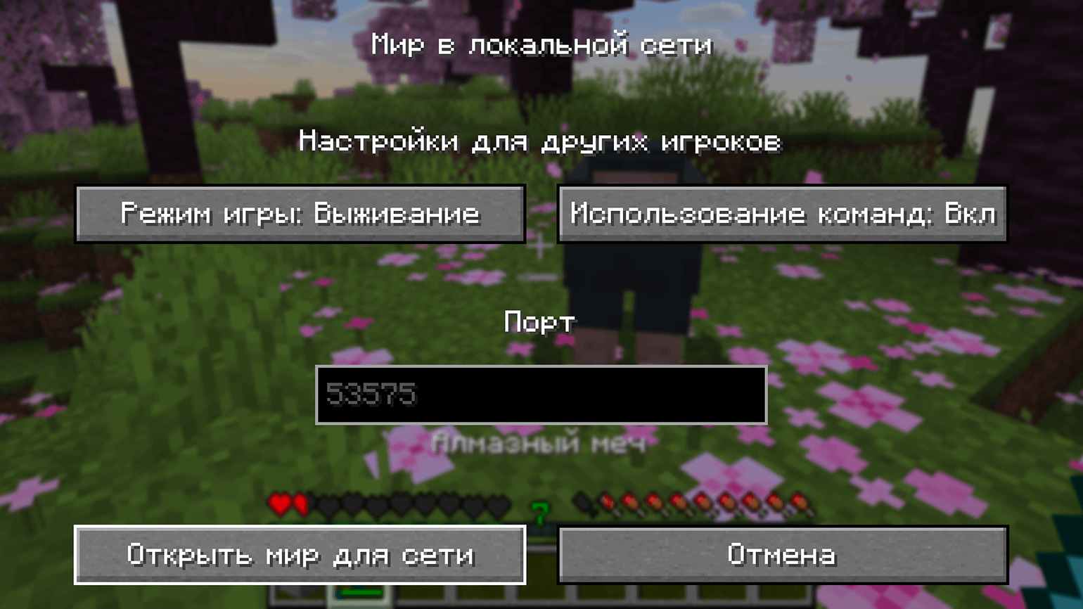 2. Когда мир запустится, откройте меню и выберите пункт Открыть мир для сети. В этом же окне можно запретить использование читов или выбрать режим игры.