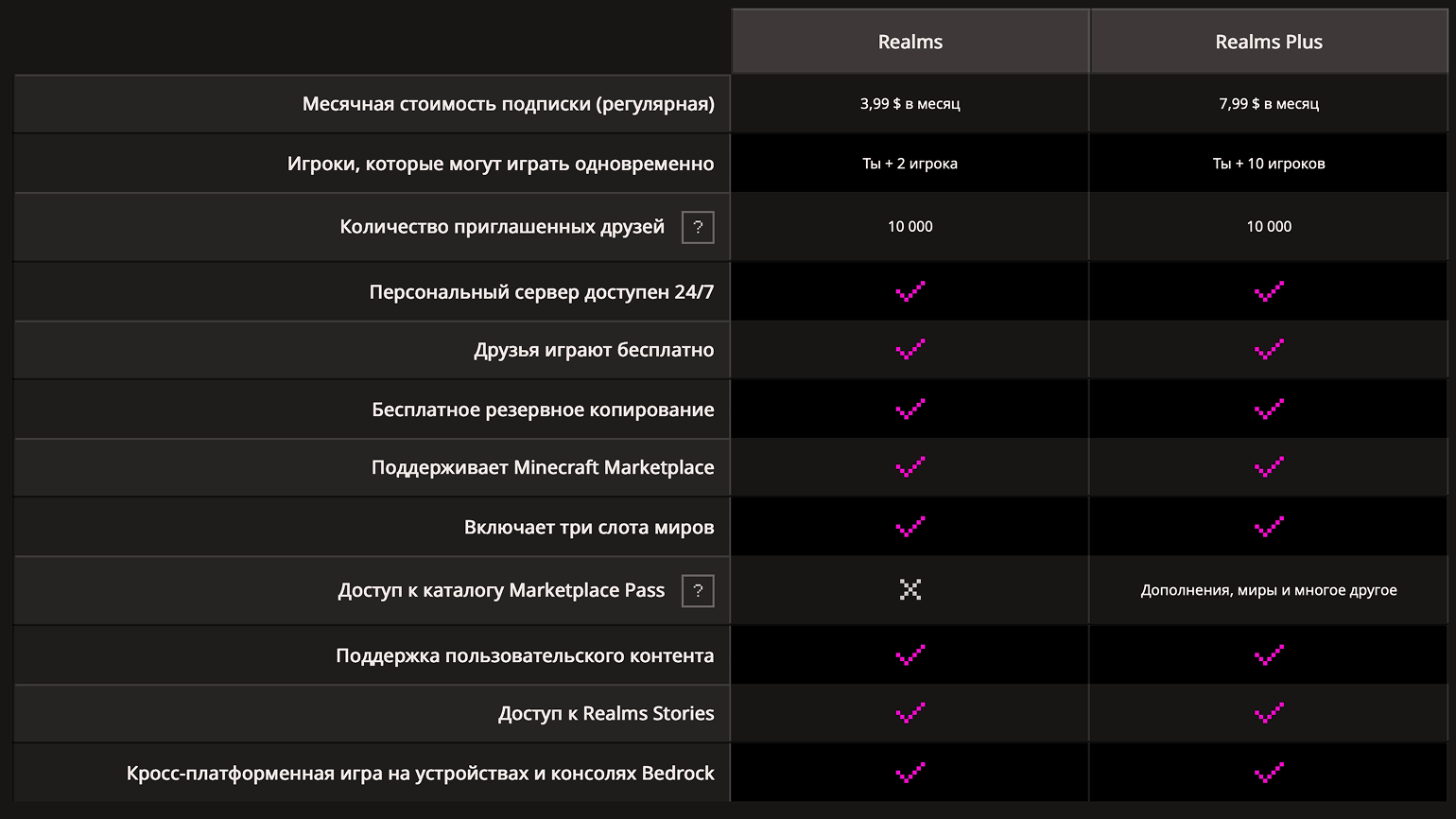 - Realms Plus поддерживает до 11 игроков и стоит 7,99 доллара в месяц. Подписчикам дополнительно доступны официальные карты и моды от разработчиков.