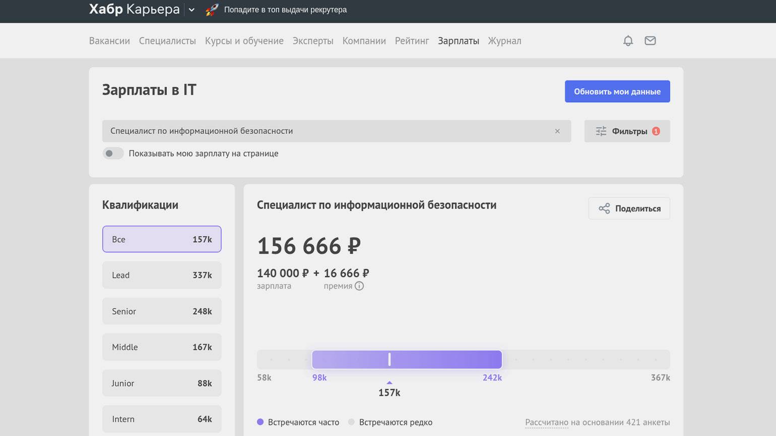 Теперь посмотрим данные зарплатного калькулятора «Хабр Карьеры». На момент подготовки материала в первой половине 2026 года медианная зарплата специалистов по информационной безопасности составляет 156 666 рублей. Она складывается из оклада 140 000 рублей и премии 16 666 рублей.