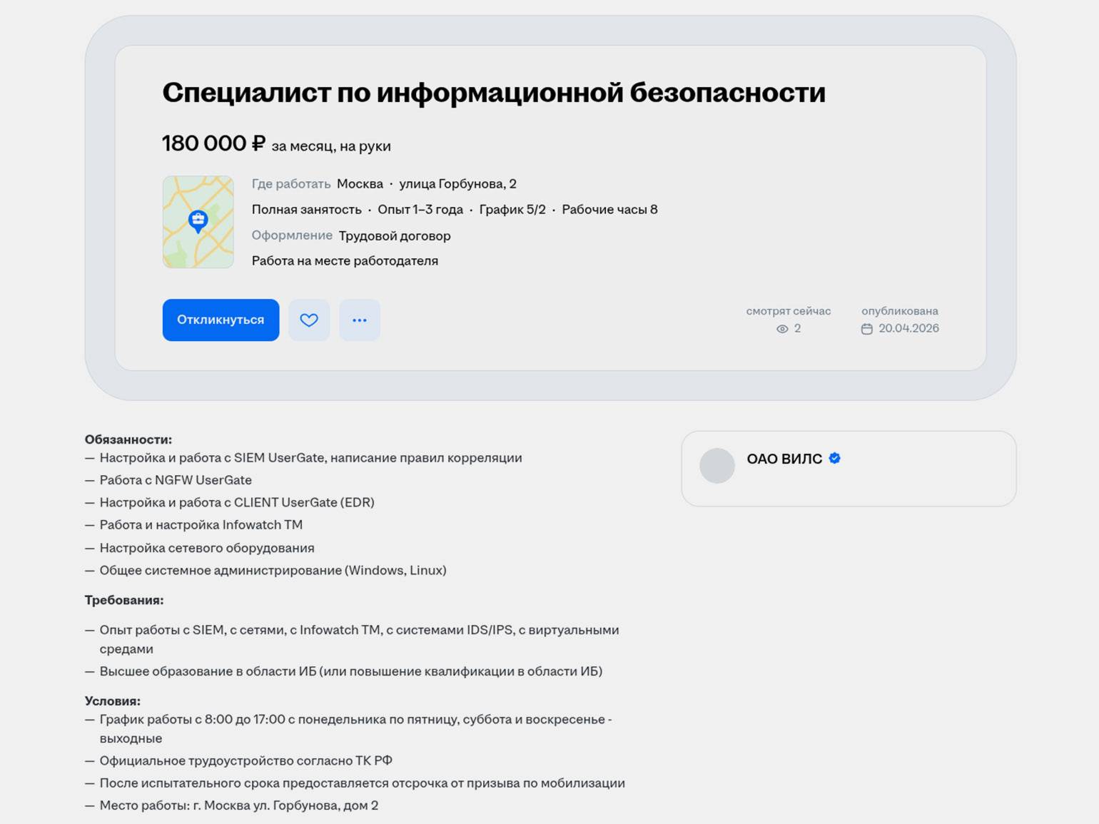 Первая вакансия рассчитана на специалиста с опытом 1–3 лет и обещает оклад 180 000 рублей. От кандидата ждут навыков работы с инструментами мониторинга и расследования инцидентов (SIEM), сетевой защитой (межсетевые экраны/NGFW, IDS/IPS), системами предотвращения утечек данных (DLP) и средствами защиты рабочих станций (EDR), а также навыков администрирования Windows и Linux и общего понимания устройства сетей.
