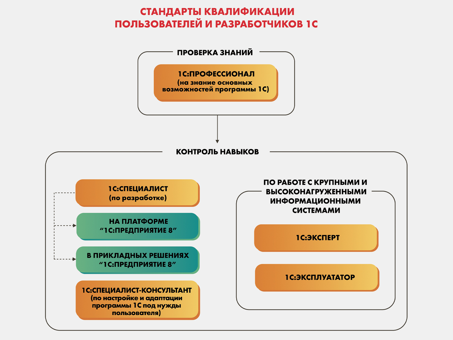 - «1С:Профессионал». Проверяются теоретические знания программиста — понимание системы «1С:Предприятие» и одной из типовых конфигураций, таких как «Бухгалтерия предприятия», «Управление производственным предприятием», «Бухгалтерия бюджетного учреждения» и так далее.