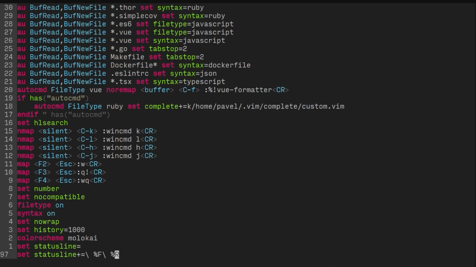Открываем .vimrc-файл. Вначале нужно очистить статуслайн. Для этого пишем строку кода set statusline=: