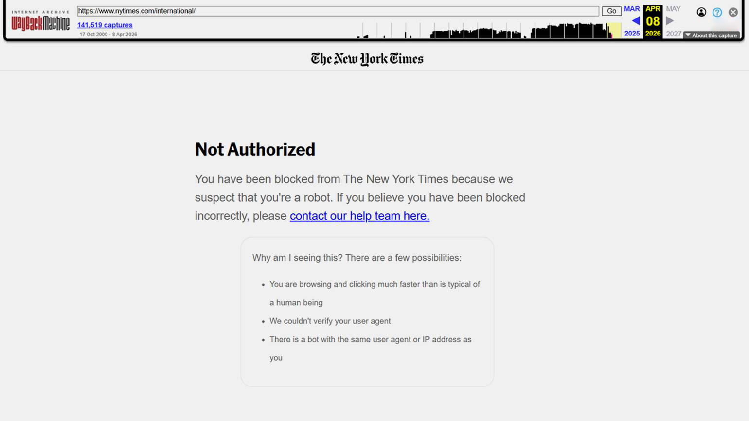 The New York Times, The Guardian и другие крупные издания в последнее время начали ограничивать доступ Internet Archive к своим архивным материалам. Из‑за этого сервис больше не сможет сохранять копии страниц, которые раньше активно использовали журналисты, исследователи и юристы.