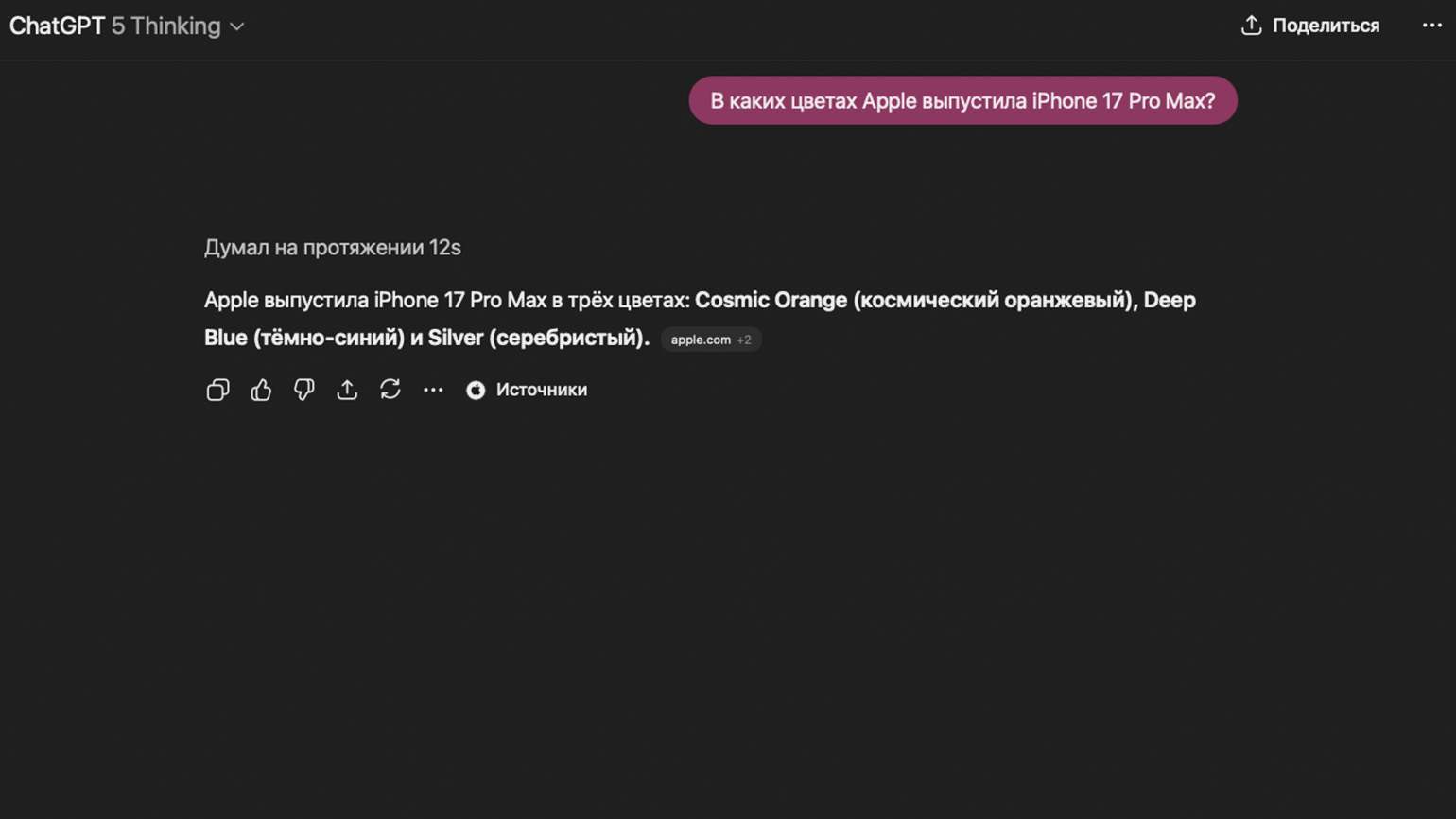 ChatGPT без проблем отвечает на этот вопрос и приводит в качестве источника официальный сайт Apple. Не спорим — веб-поиск важен.