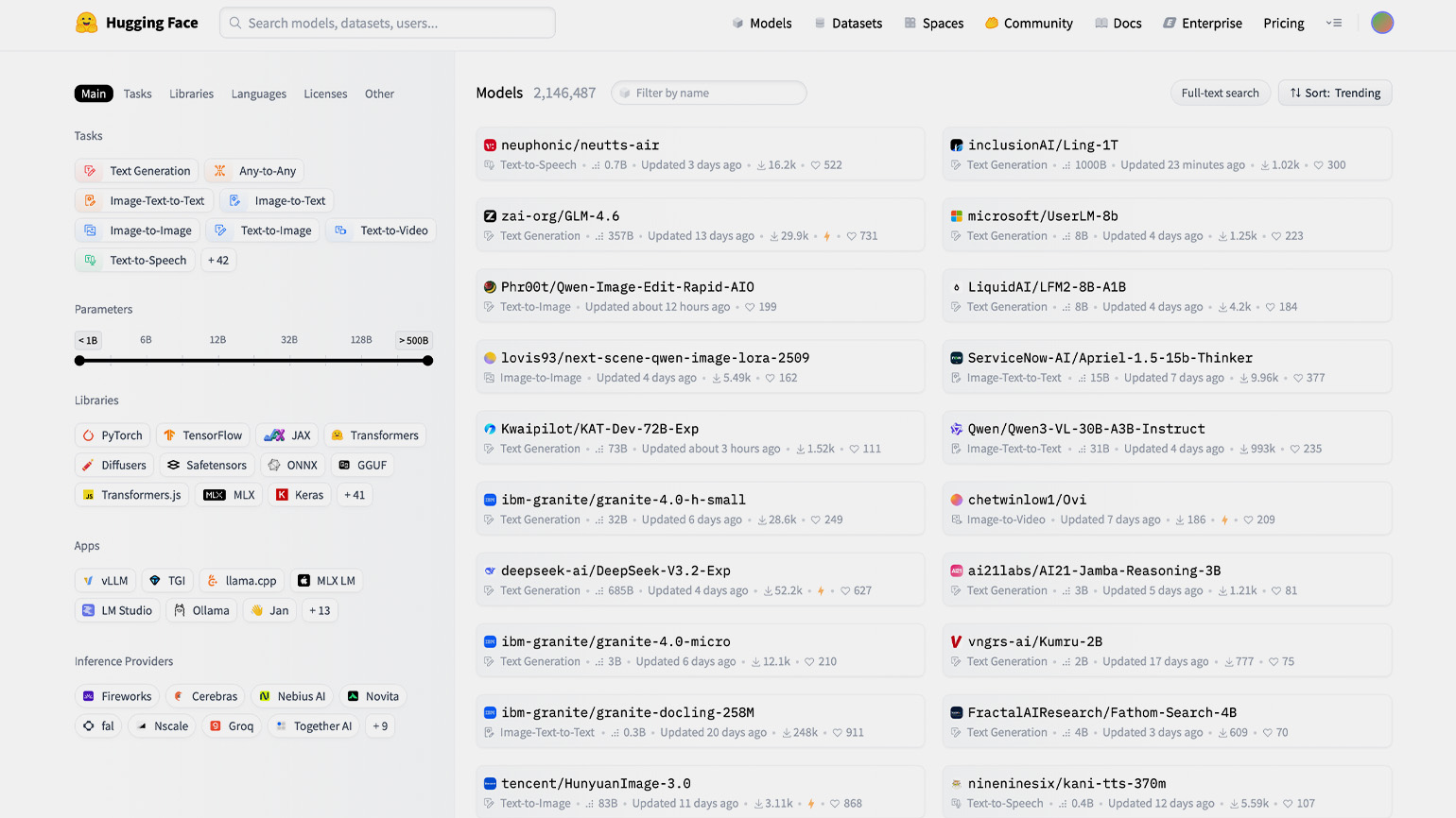На сайте добавлены фильтры, через которые удобно искать модели. В них вы можете выбрать число параметров, задачи, поддерживаемые языки, адаптацию под конкретные приложения для запуска и оптимизацию под требования провайдеров. А дальше вы просто заходите в LM Studio и через поиск находите подходящую нейросеть.