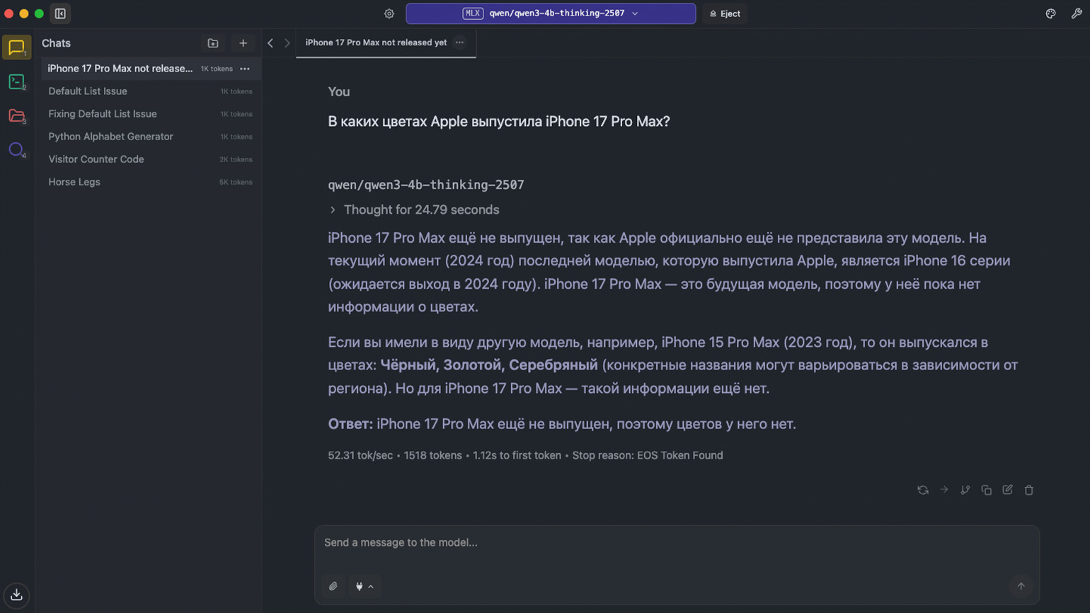 У нашей Qwen 3 нет доступа к веб-поиску, поэтому она способна выдумывать события и искажать информацию. Мы спросили, в каких цветах Apple выпустила iPhone 17 Pro Max. В ответ нейросеть заявила, что это будущая модель, поэтому данных о дизайне у неё пока нет.